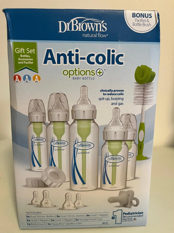 Selling a Dr. Brown's Natural Flow Anti-Colic Options+ baby bottle gift set! This set is designed to grow with baby and is clinically proven to reduce colic, spit-up, burping, and gas.