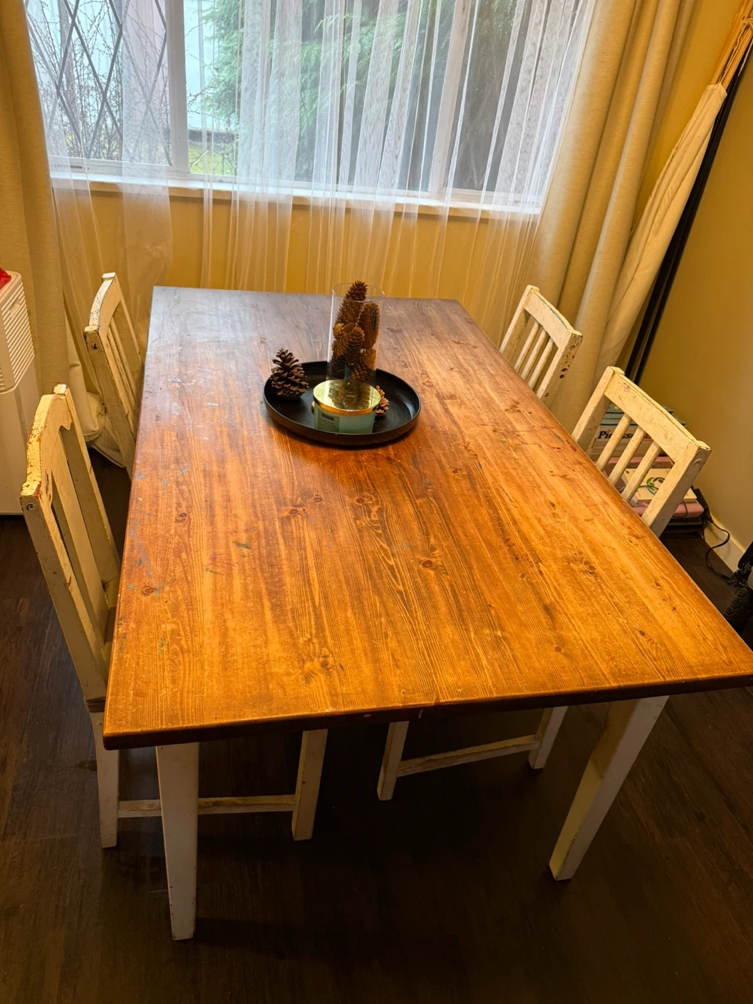 A home project! Needs a good sanding and stain it a colour of your liking! Legs of table and Chairs also need repainting.