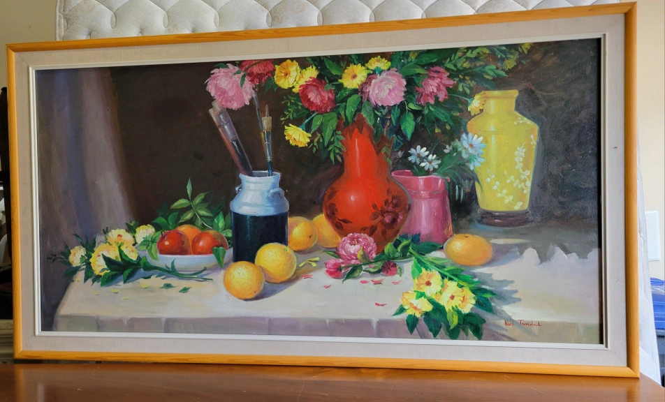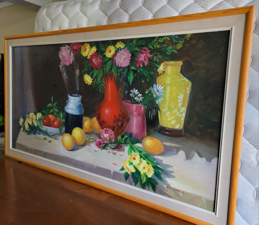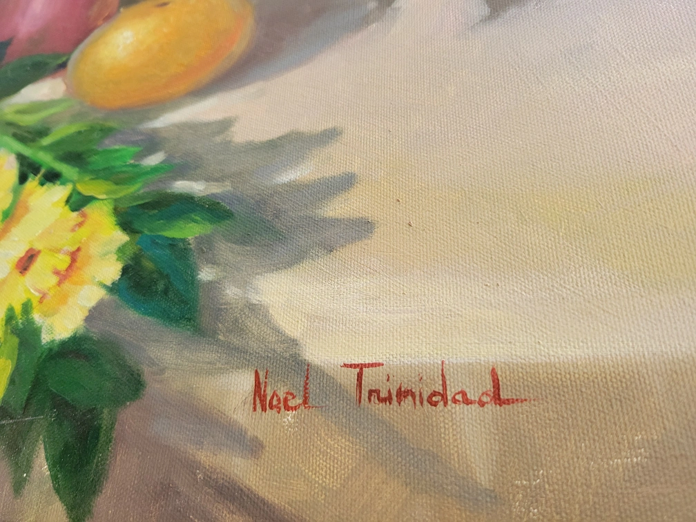Signed oil painting by Noel Trinidad depicting a floral arrangement with fruits and a vase in very good condition for a very good price. let me know if you're interested.