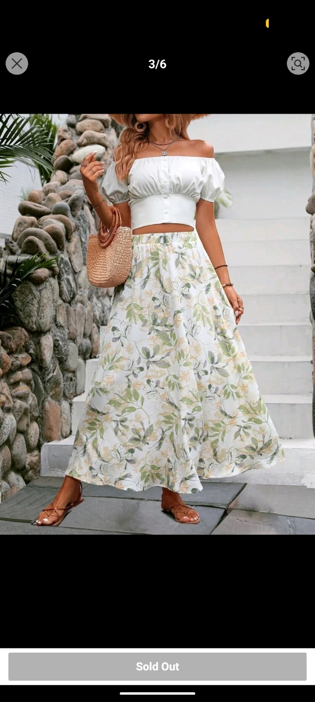 This flowing maxi skirt features a beautiful white base with a green and yellow floral print. It has an elastic waist for comfortable wear. It's perfect for warm weather outings!