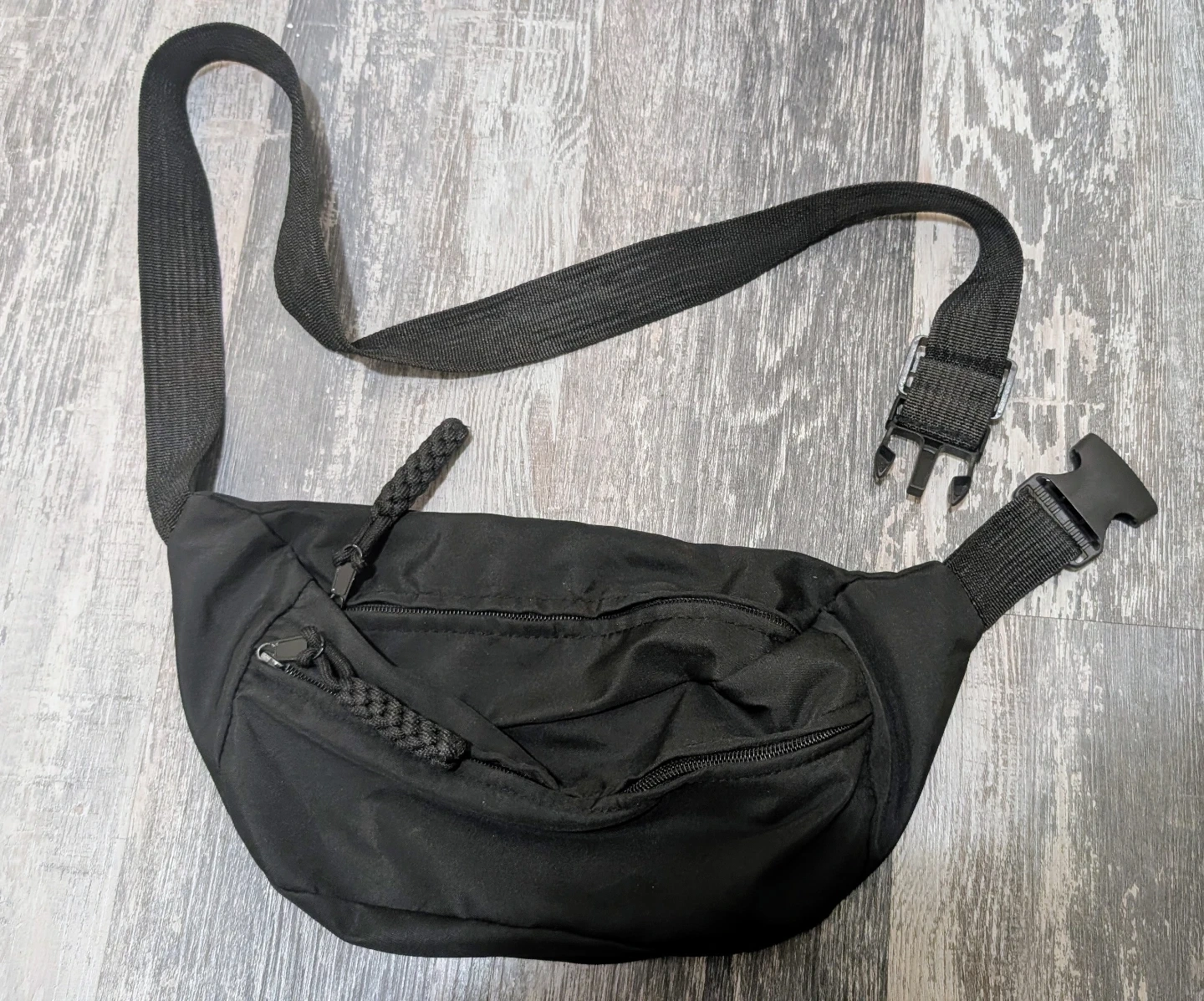 This black fanny pack has multiple zippered compartments for secure storage. The adjustable strap with a buckle makes it easy to wear around your waist or across your body. It's made from durable fabric. Like new. Perfect condition.