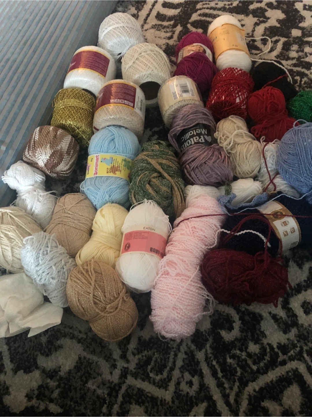 A variety of yarn skeins in different colours and textures. Includes brands like Eaton and Patons. Perfect for knitting and crochet projects!