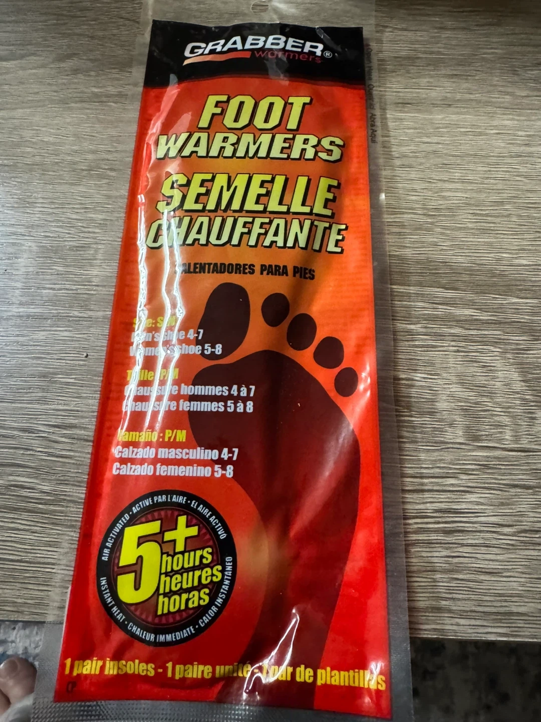 These Grabber foot warmers provide instant heat for 5+ hours. They are air activated and come as 1 pair of insoles. Sized for men's shoe 4-7 and women's shoe 5-8.