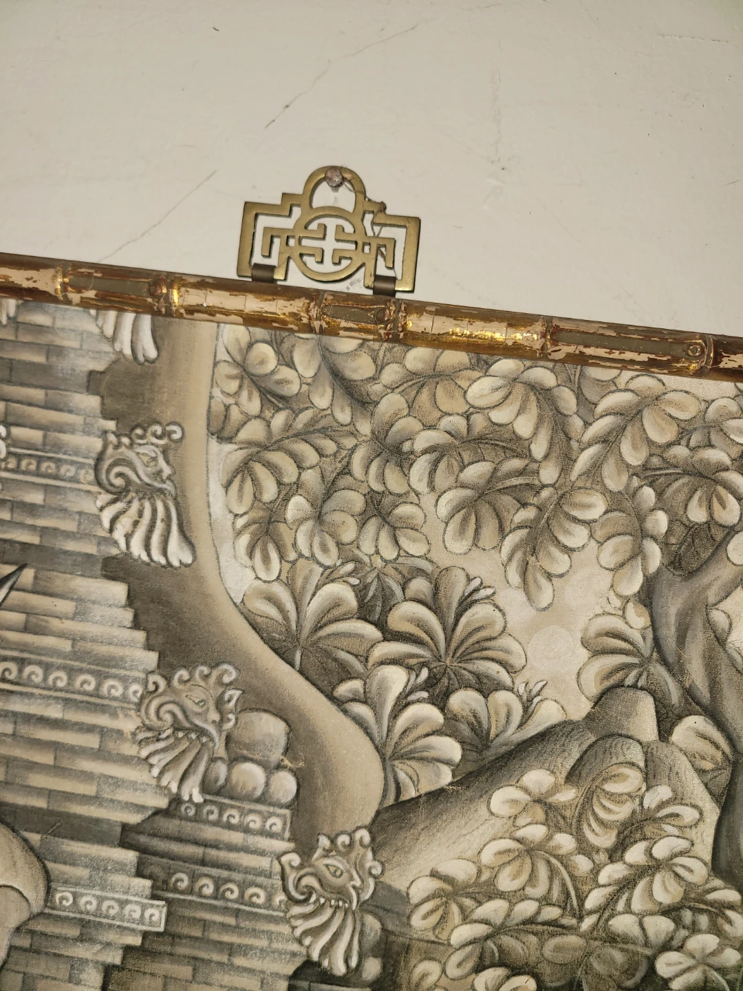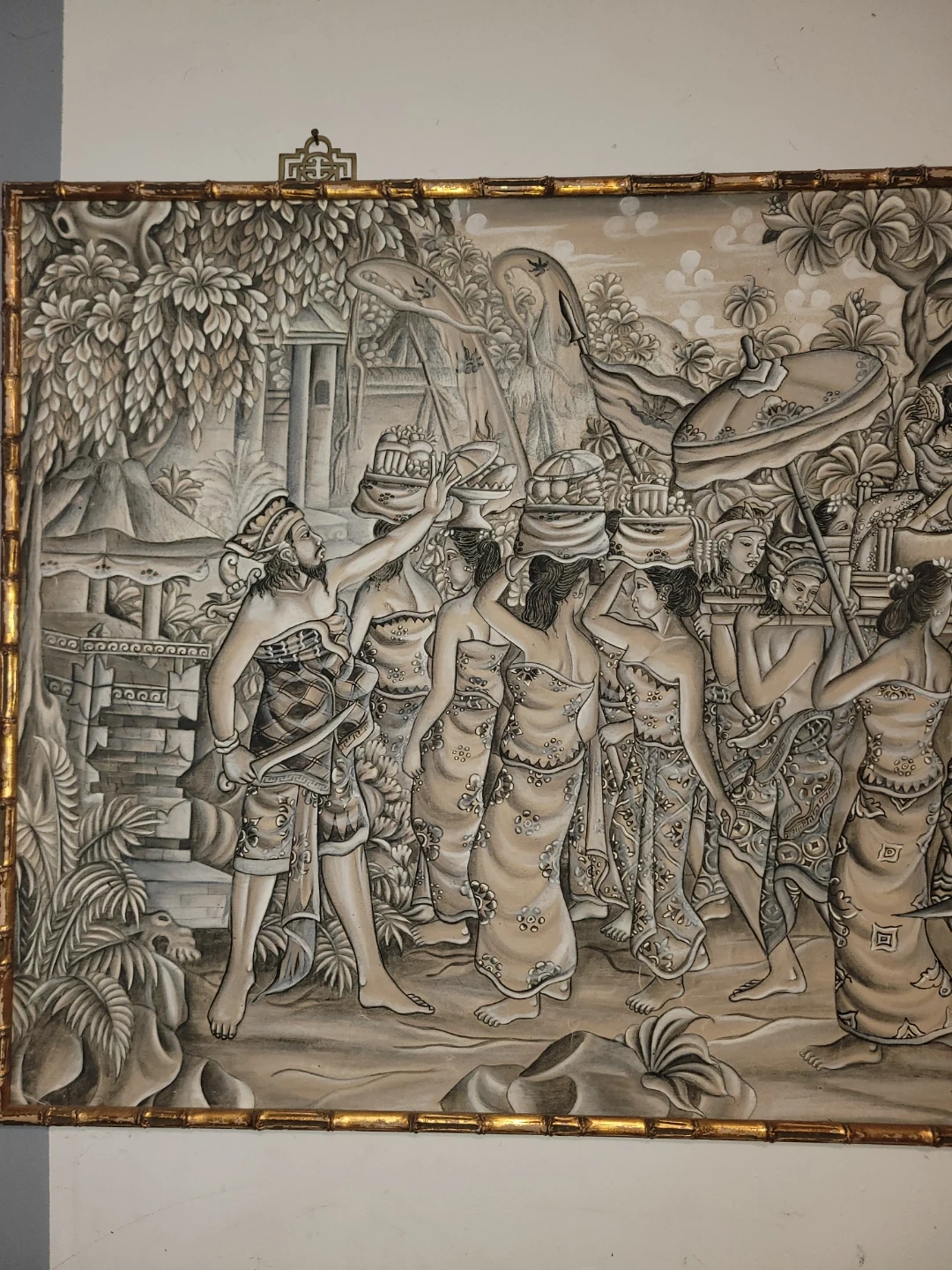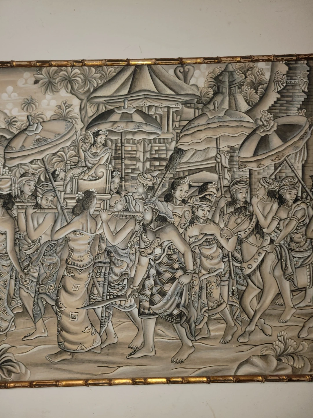 Beautiful Bali painting by W. Bledéh, featuring a detailed scene with figures and architecture. The painting is framed with a unique bamboo-style border, adding to its charm and character