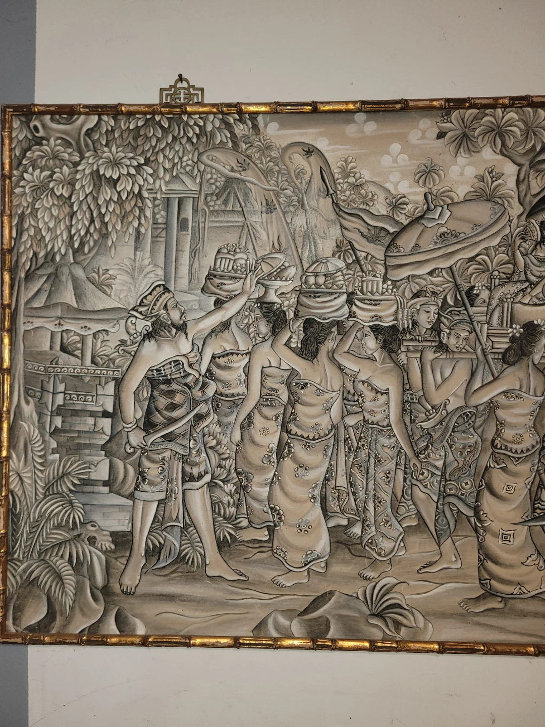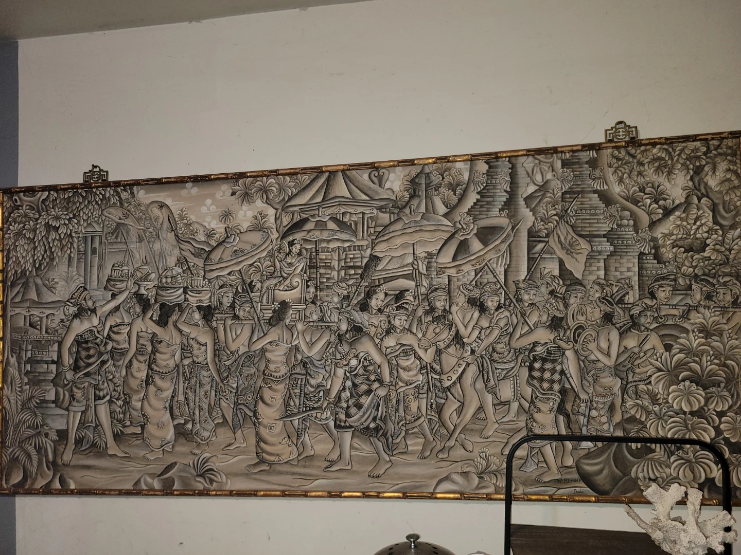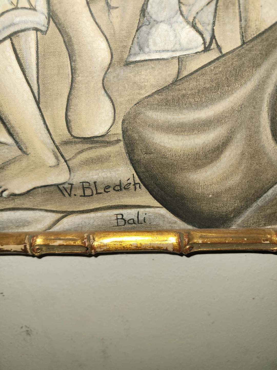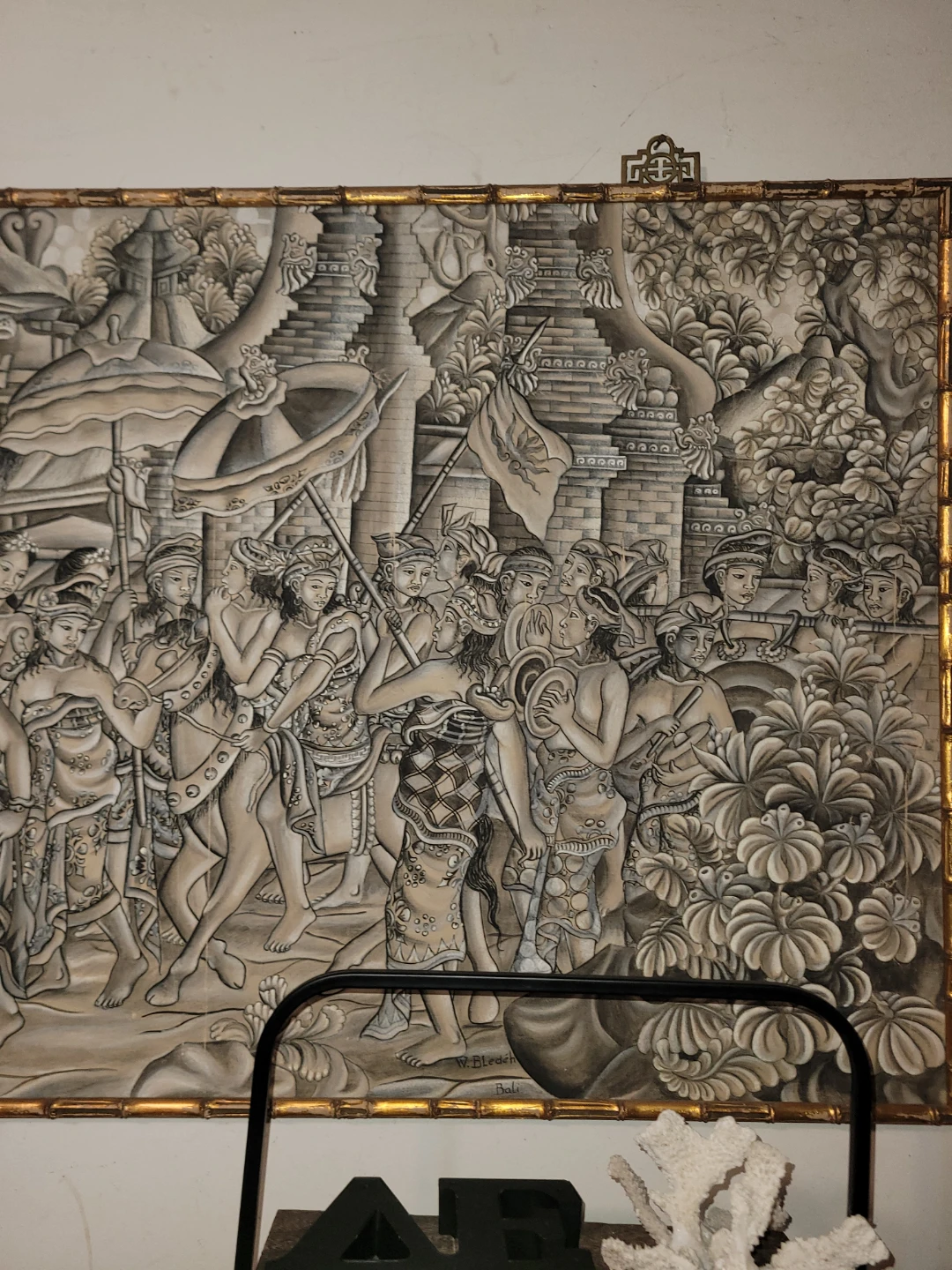 Beautiful Bali painting by W. Bledéh, featuring a detailed scene with figures and architecture. The painting is framed with a unique bamboo-style border, adding to its charm and character