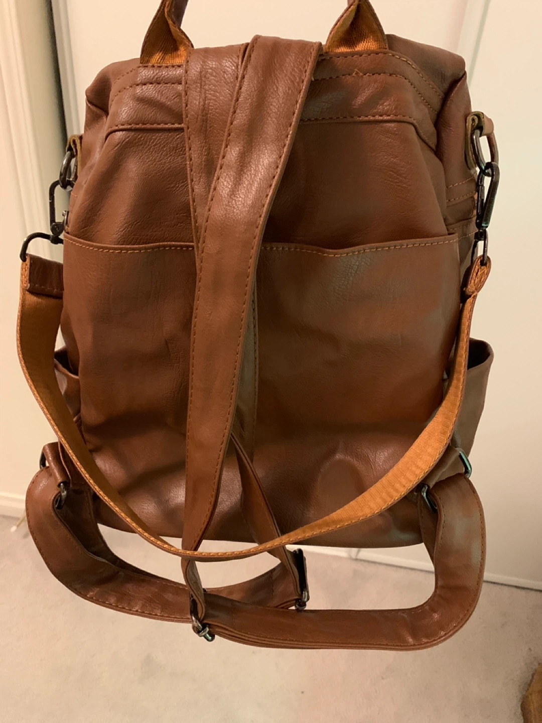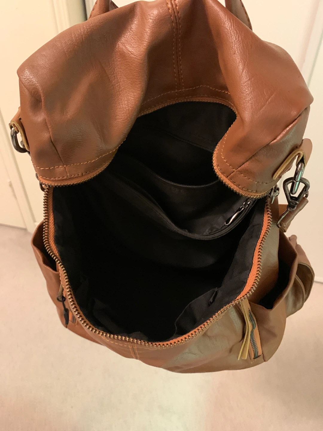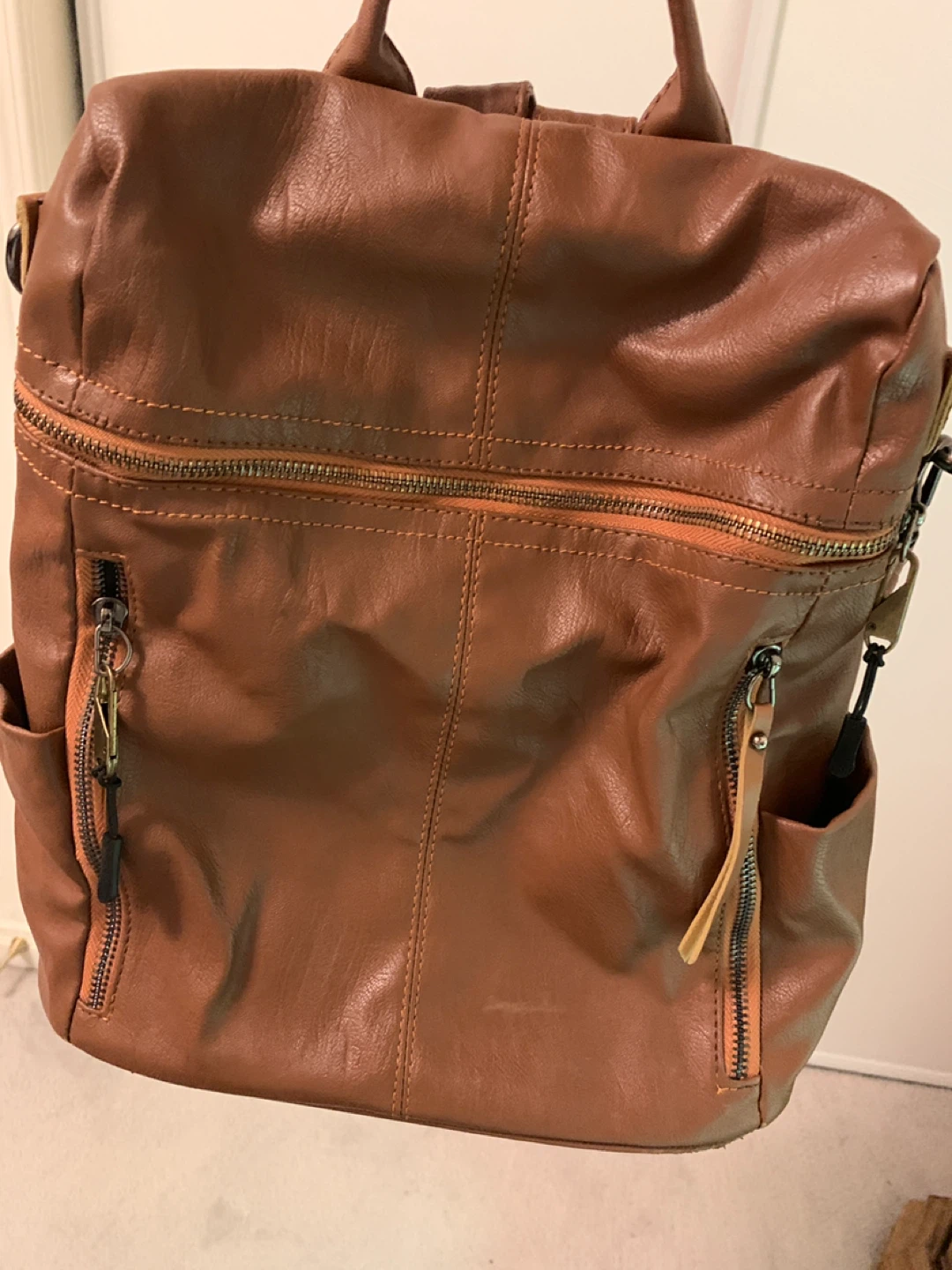 Brown faux leather backpack with multiple zippered pockets. Interior has a dark lining and zippered compartment. Has top handles and adjustable shoulder straps.