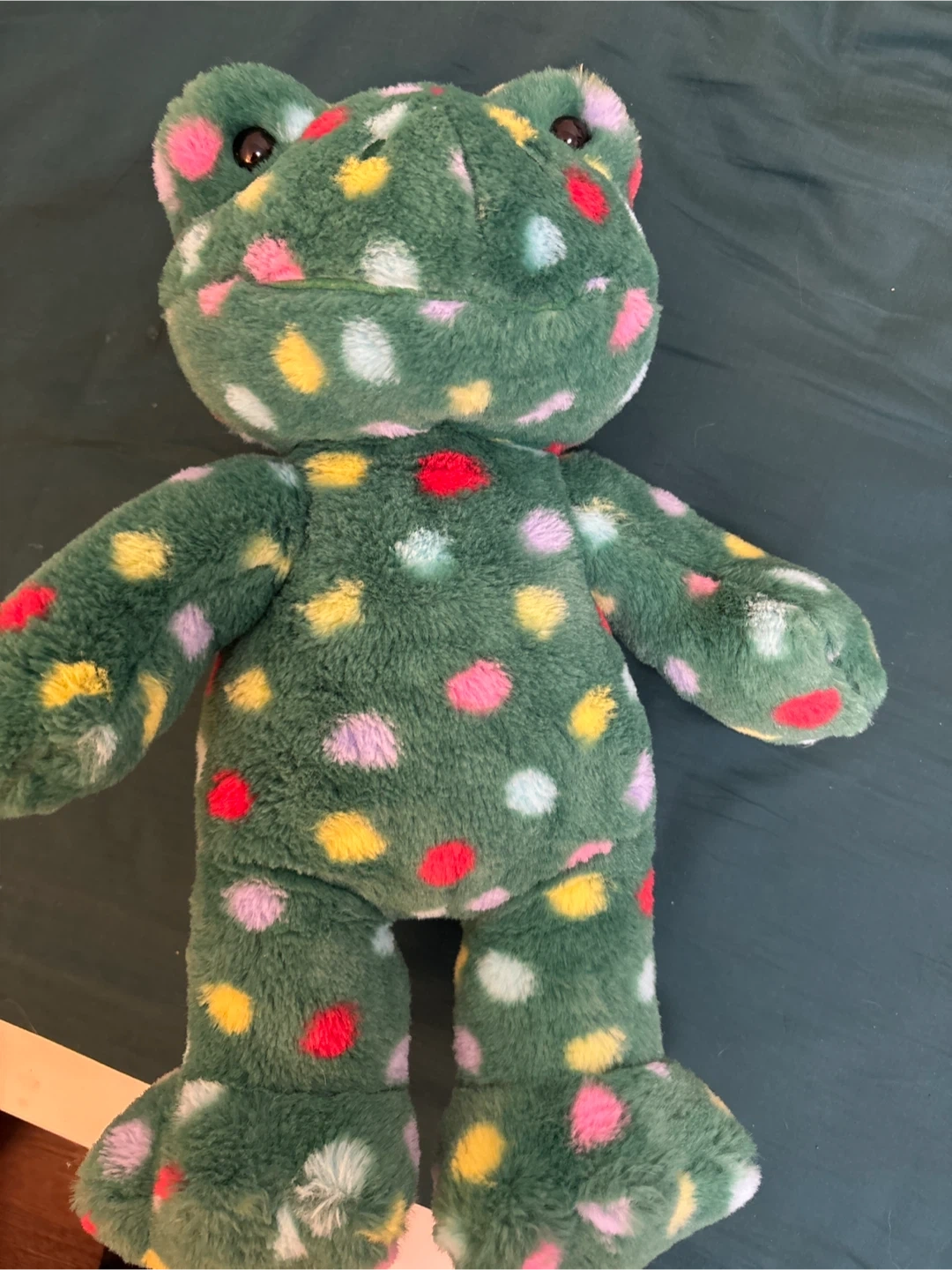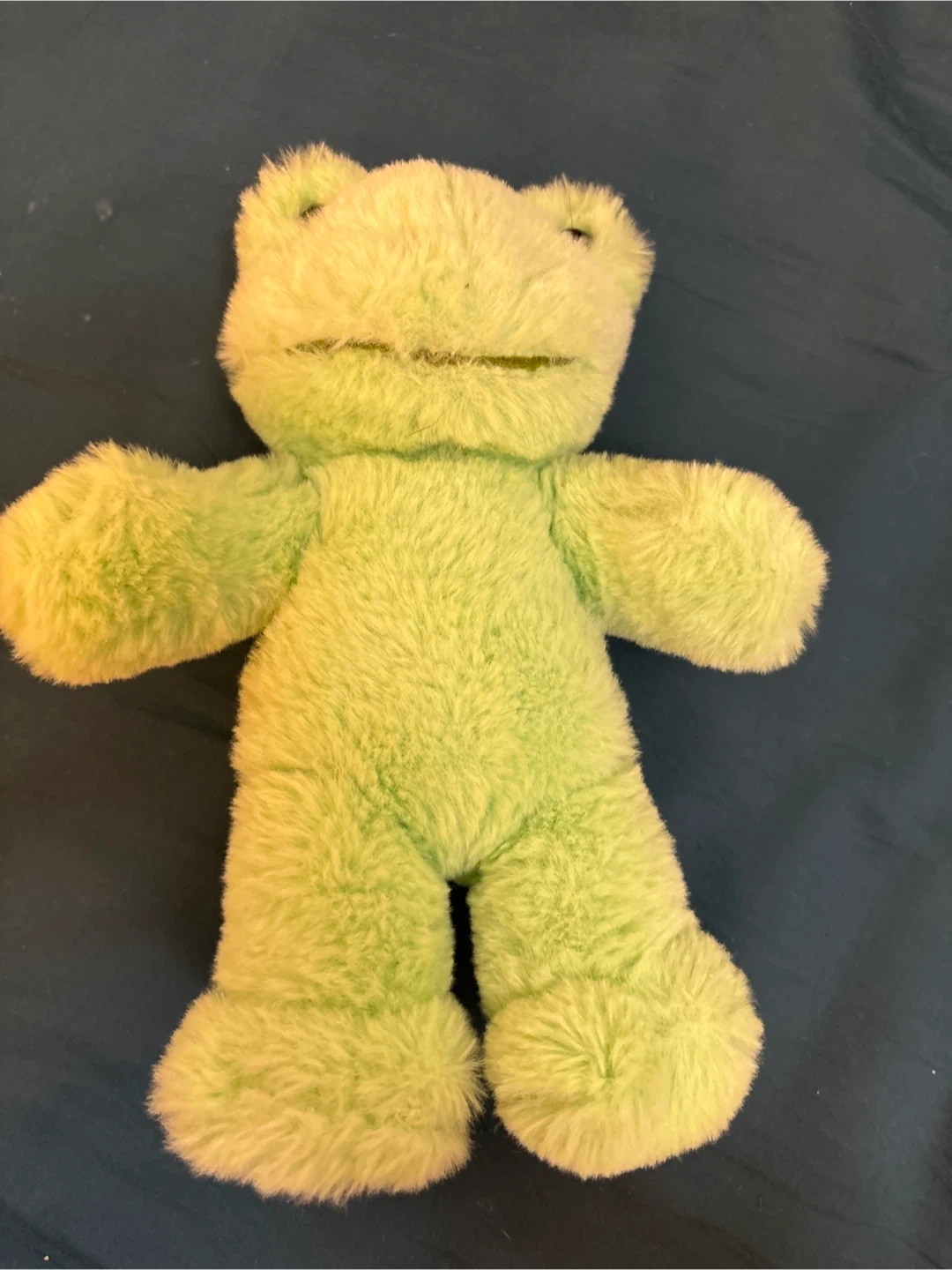Two Build a Bear frog plushies. The dark green one is a holiday edition from 2022, light green is a small frog