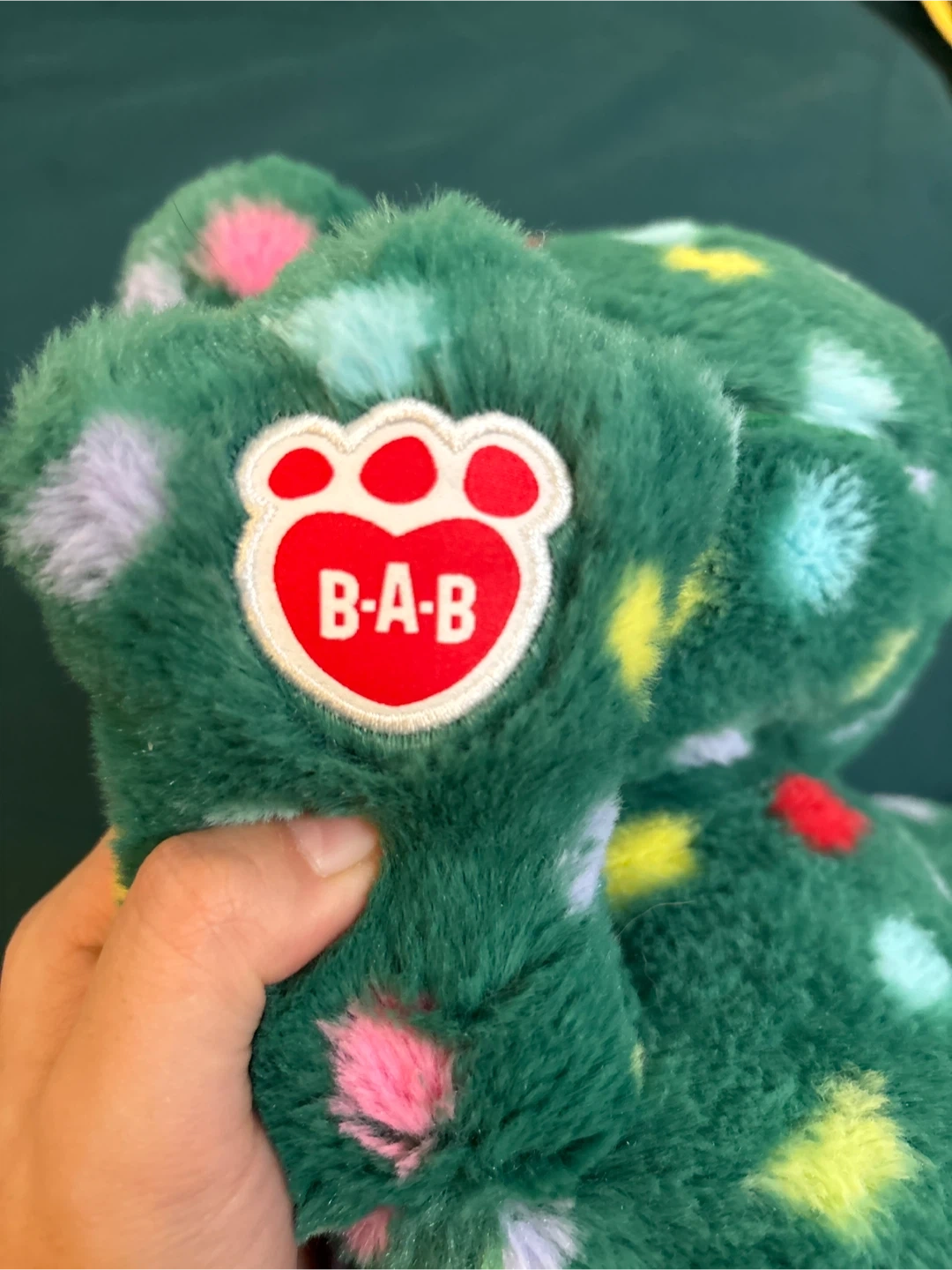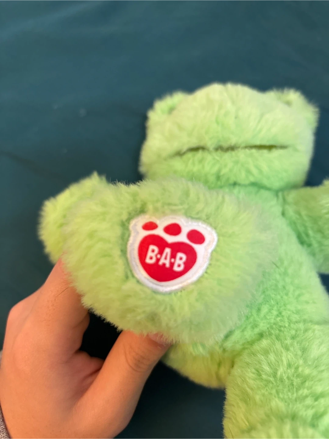 Two Build a Bear frog plushies. The dark green one is a holiday edition from 2022, light green is a small frog