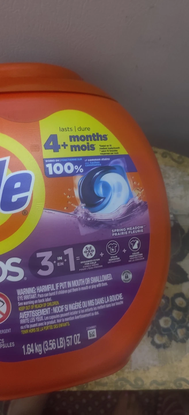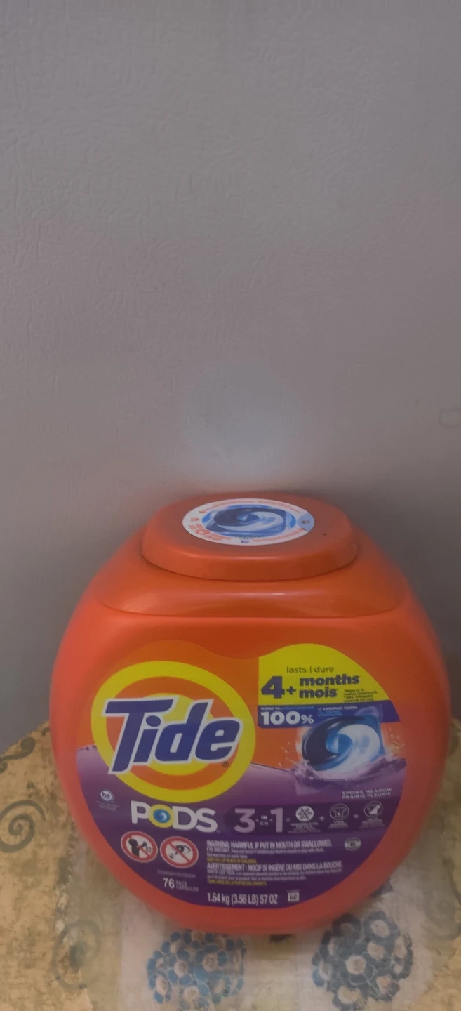 Tide Pods 3 in 1 laundry detergent comes in a Spring Meadow scent. It's designed for cold water and offers stain removal. Includes 76 pacs.