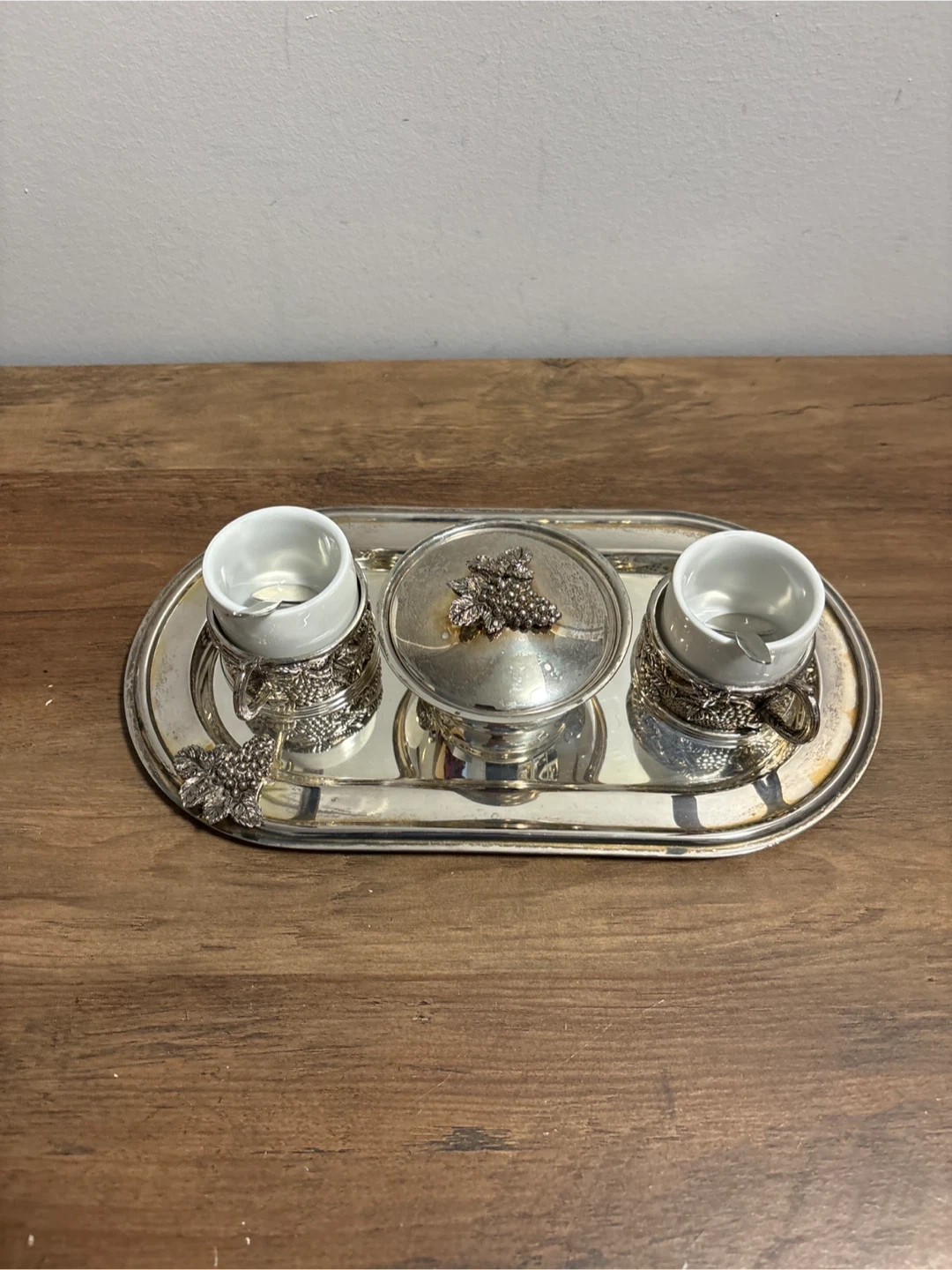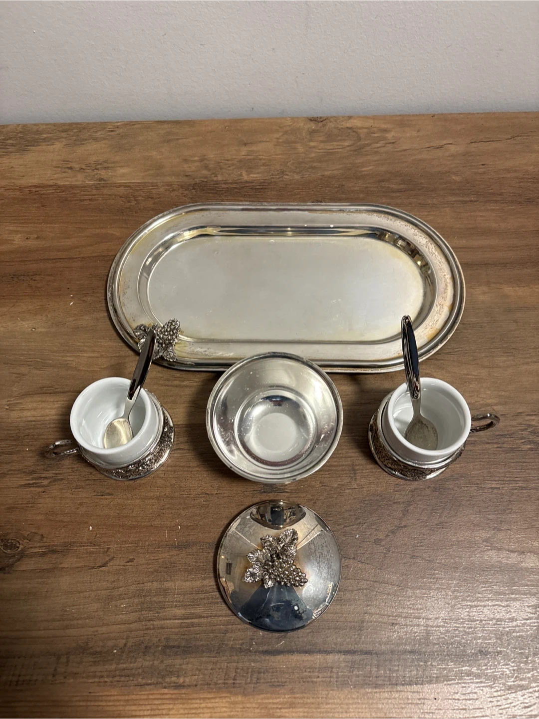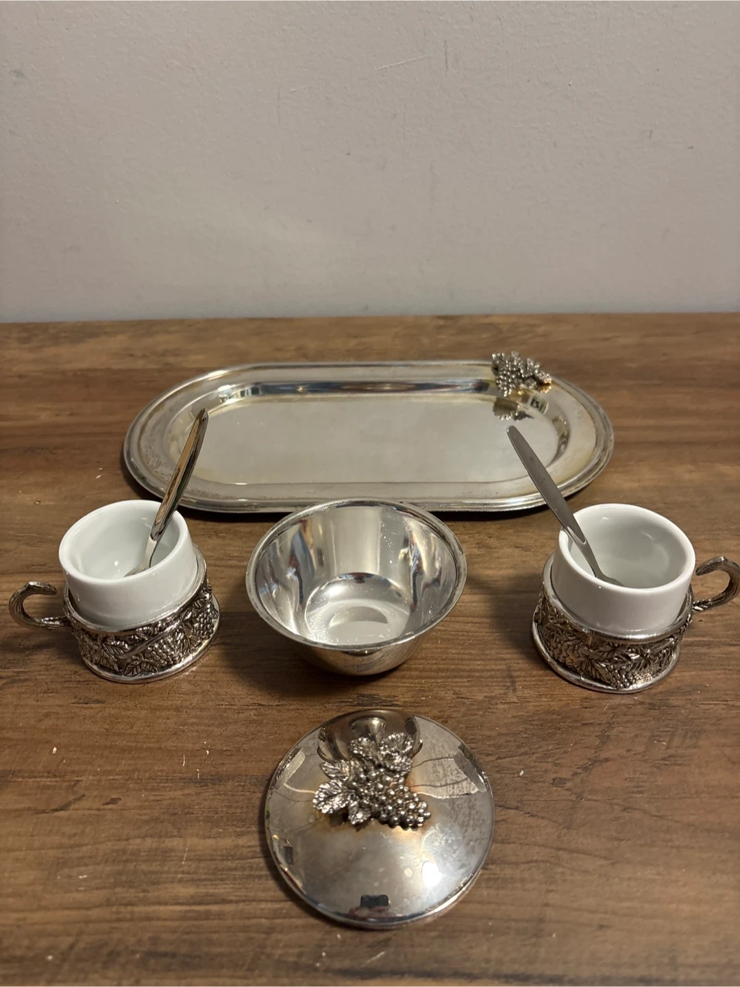 A lovely vintage coffee or tea set including two cups and saucers, a covered sugar bowl, and a serving tray. The decorative silver plating has a beautiful intricate design. It's perfect for serving a small couple or for display!