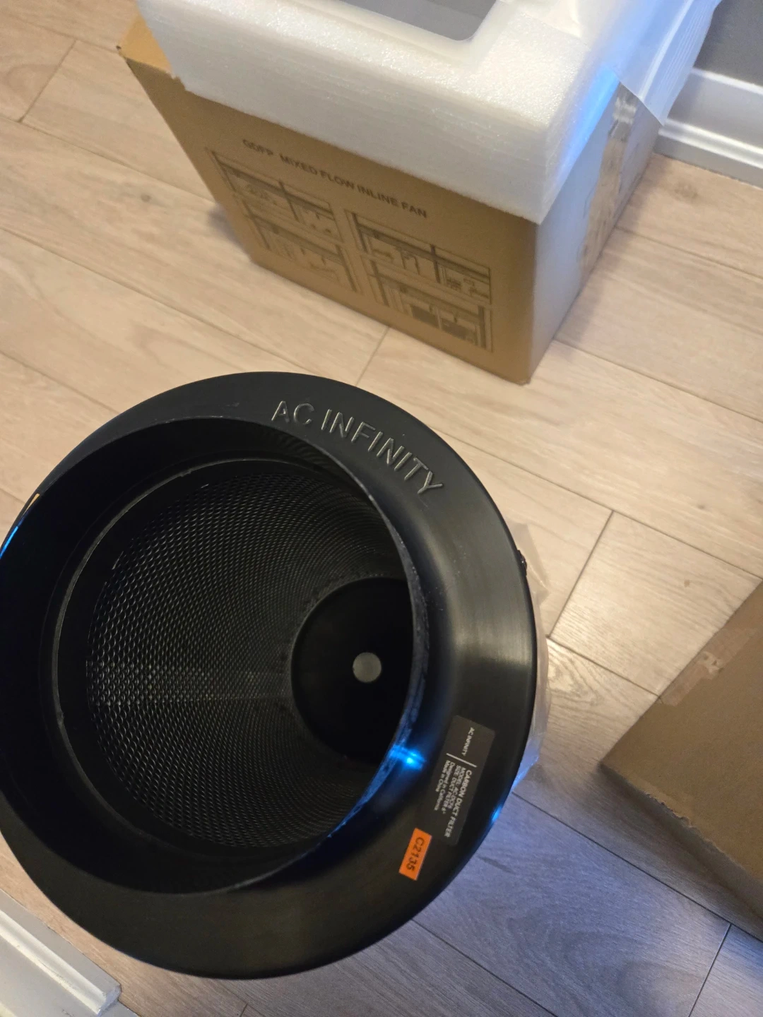 This is an AC Infinity CF-412 carbon filter with pure charcoal. It's designed for mixed flow inline fans. Comes with hanging fixtures and washable cloth cover. Set up and tested, but never used! Has some tape marks around the duct connection from when it was set up, but still in excellent condition. Box was damaged while product was set up. No damage to the actual product. Also have a Phantom LED Pheno 440 grow light and GDF 150-P inline fan (check my other listings). Can do a packed deal of interested!