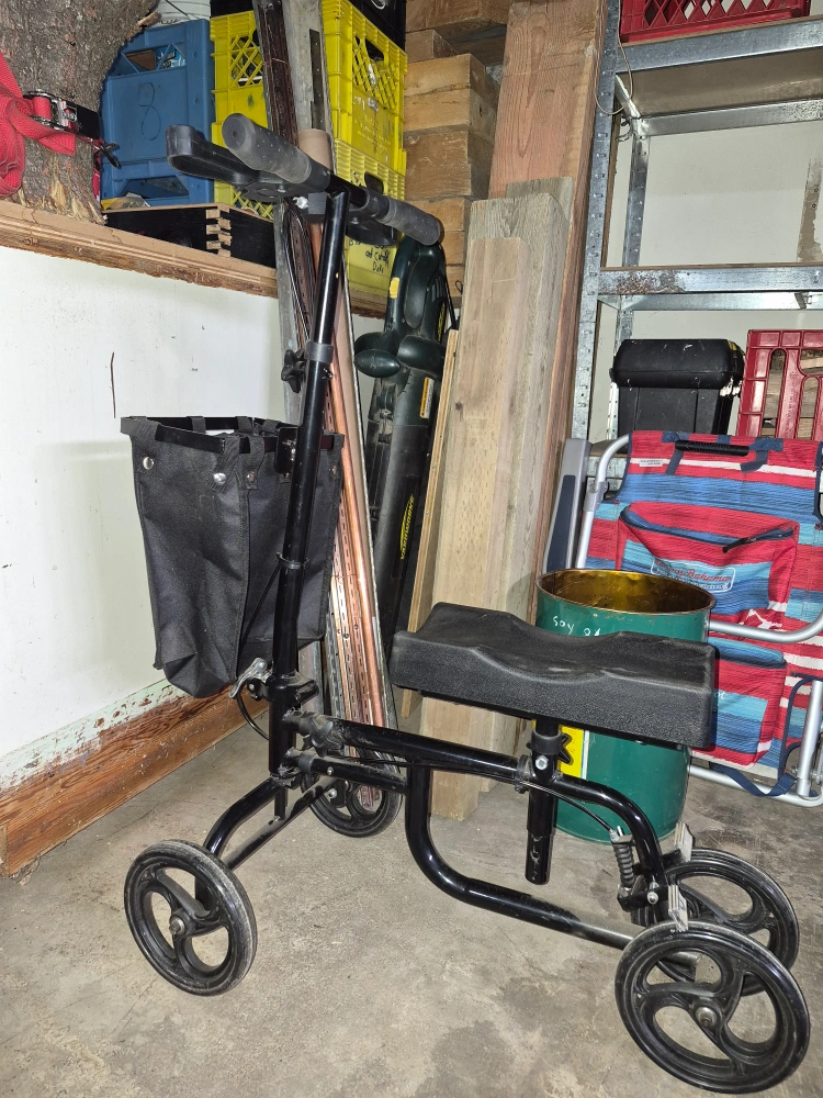 Selling a used knee walker scooter. It has a comfortable knee pad and a basket for storage. Great for getting around while recovering from a foot or ankle injury. The wheels are in good condition and it's easy to steer