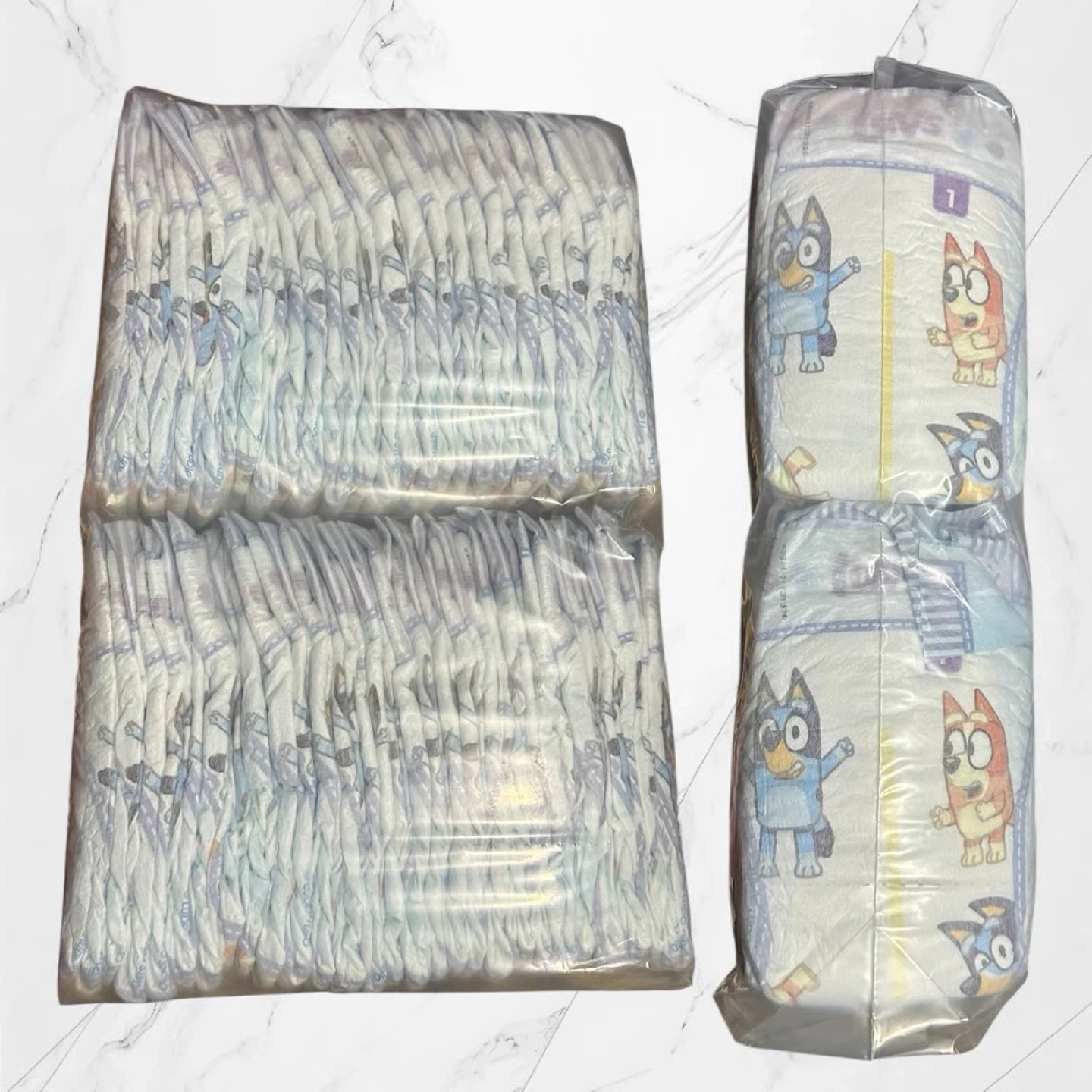 Selling a pack of Bluey diapers, size 1. These are perfect for your little one! They feature adorable Bluey characters.