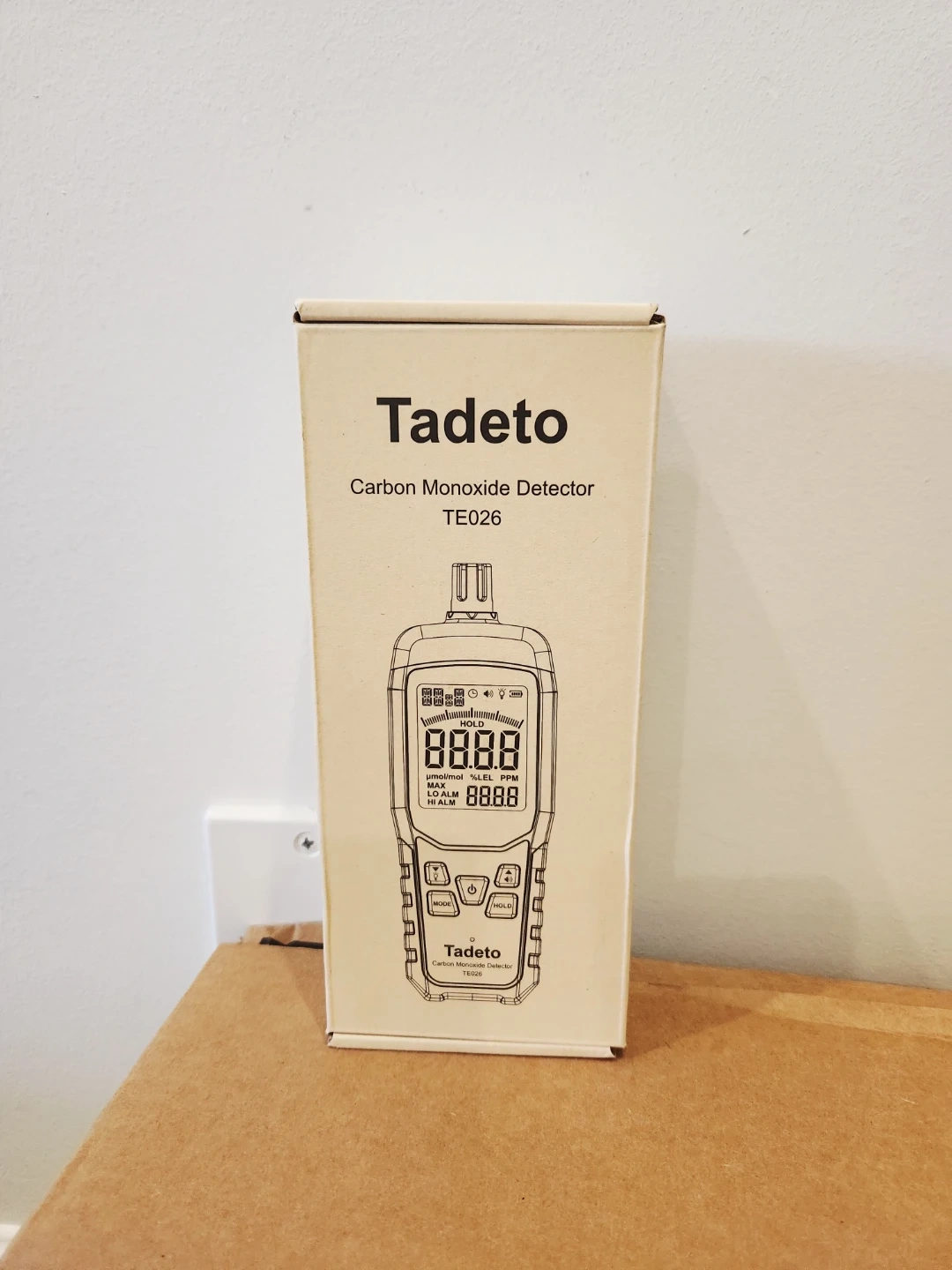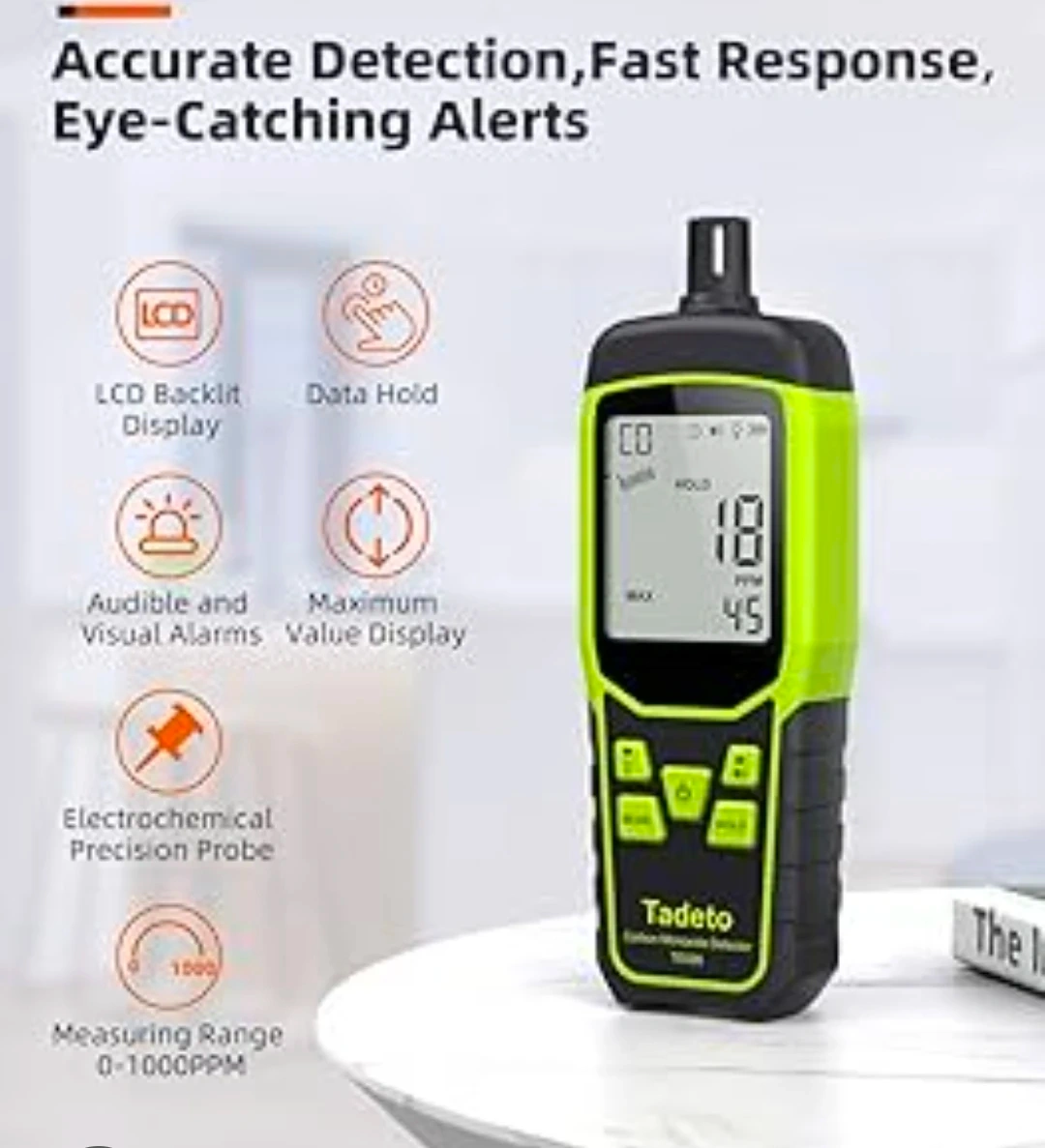 This is a Tadeto TE026 portable carbon monoxide detector. It has an LCD backlit display and an electrochemical precision probe. The measuring range is 0-1000PPM. It's useful for monitoring air quality in your home.