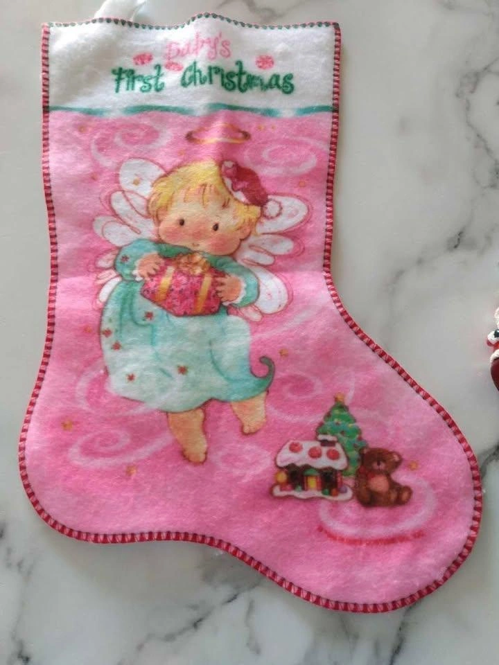 A sweet little stocking to celebrate baby's first Christmas! It's pink and features an angel. $5.00
