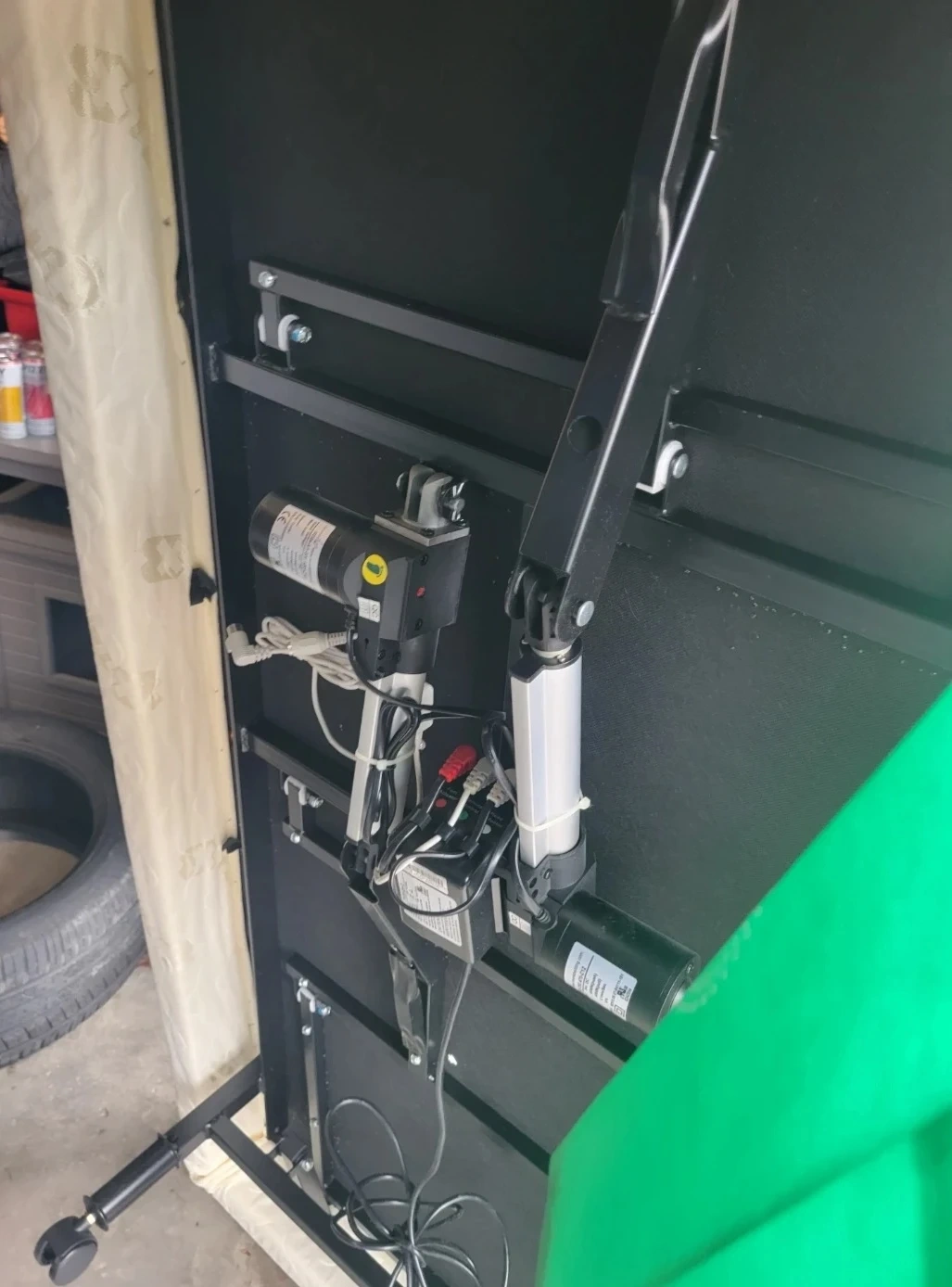 Adjustable bed base frame with wired remote control. Includes motors and frame components. It's a functional electric bed base. Matress including