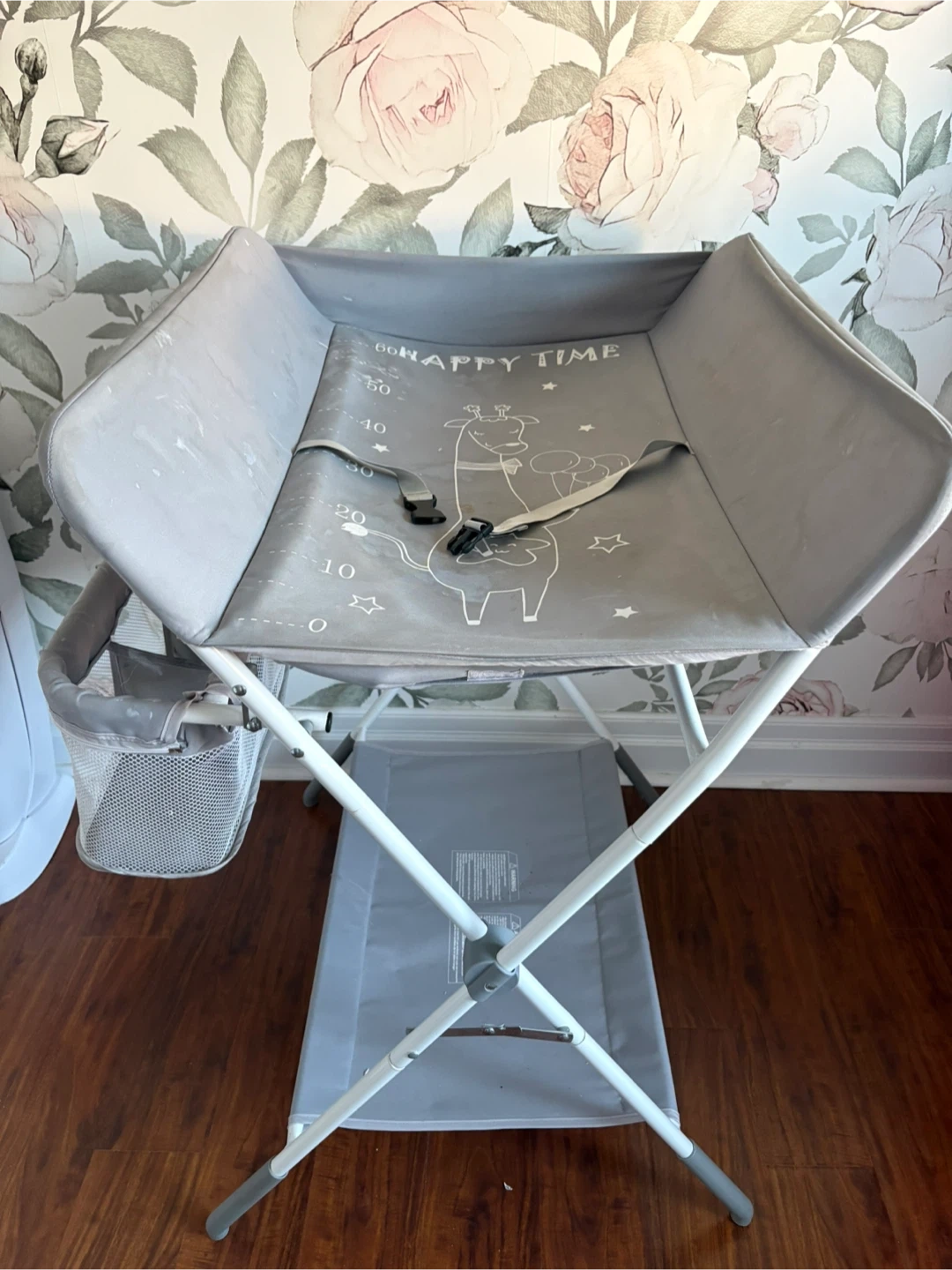 Used: Portable grey infant changing table with a safety strap and a side storage basket. Features a built-in measurement guide for tracking baby's growth. Easy to fold for storage.