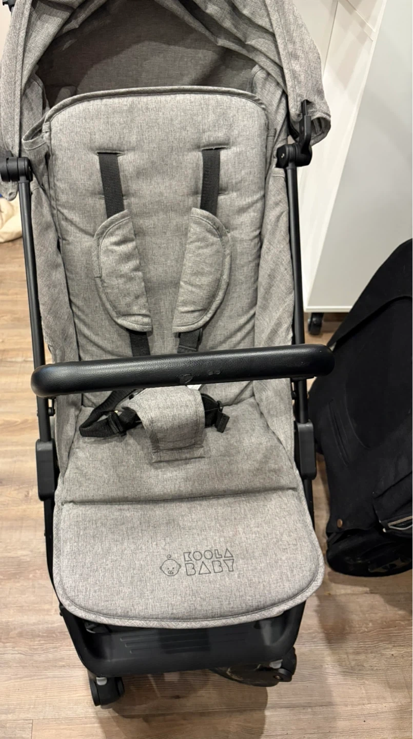 Grey Koola Baby stroller with a canopy and five-point harness. Includes a storage basket underneath. Folds easily for transport.
