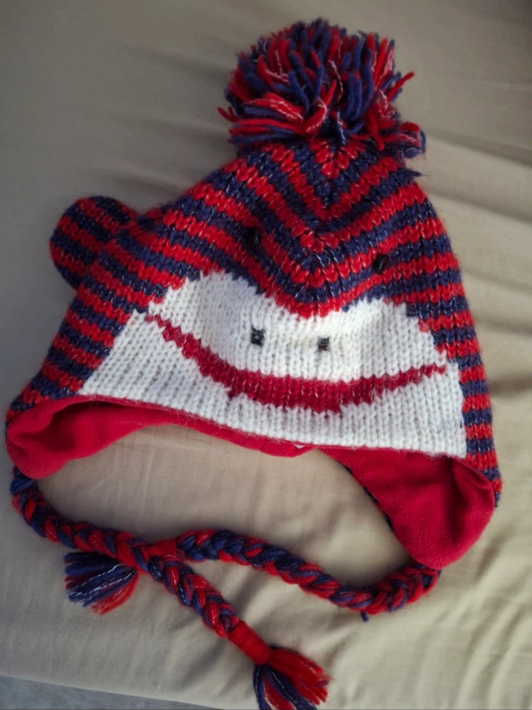 546Red, blue, and white striped toque with monkey face and ear flaps. Fits adults and kids. Never worn.