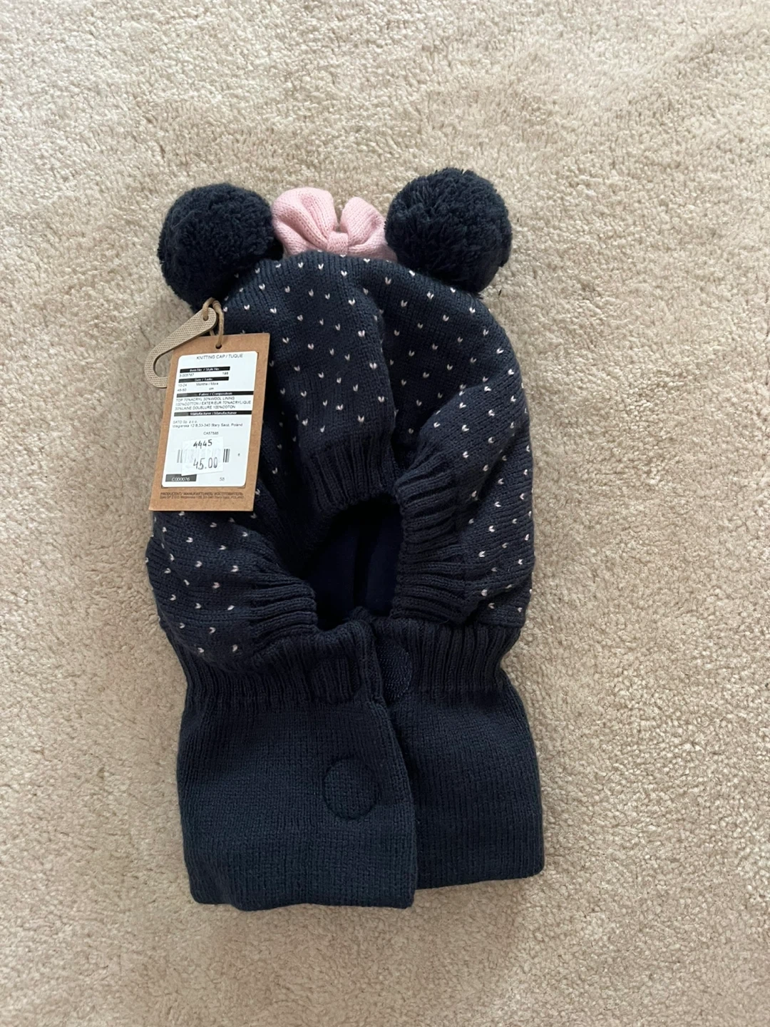 Here's a cute knitting cap or tuque, perfect for keeping your little one warm! It features adorable pom poms and a stylish design. Originally priced at $45.00+ tax. Made in Europe.