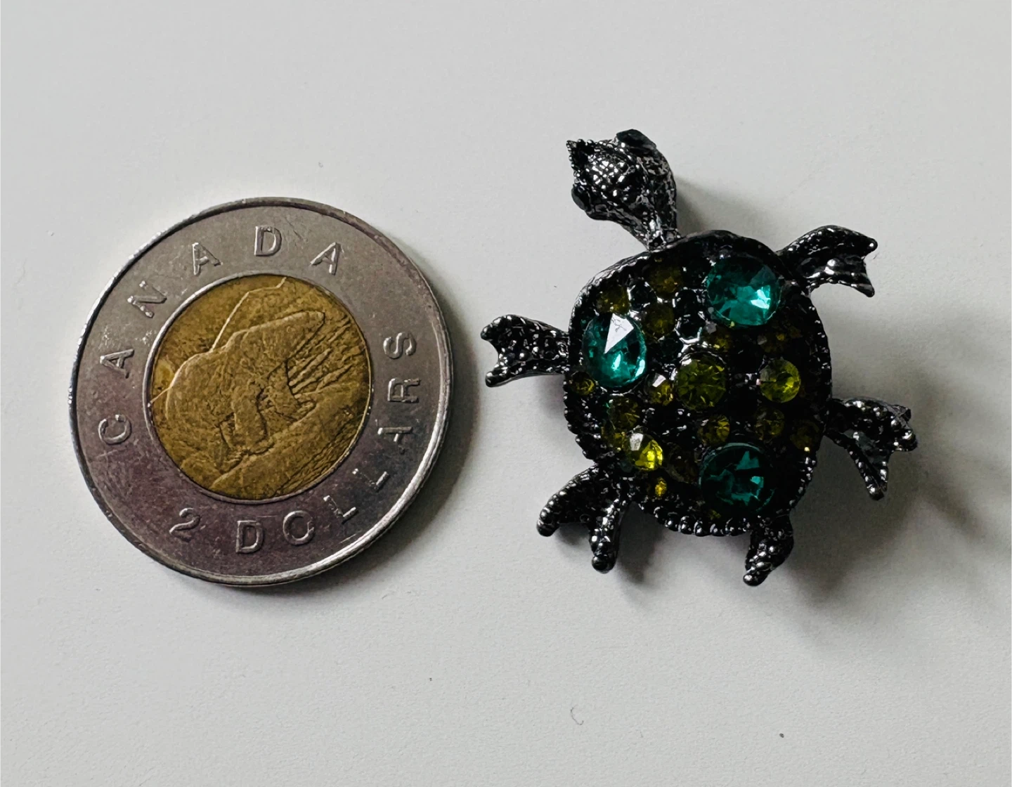 A cute charming turtle-shaped brooch pin adorned with green and bluish rhinestones. Its dark metal finish gives it a vintage look. It's small, perfect for adding a touch of whimsy to a jacket or scarf.