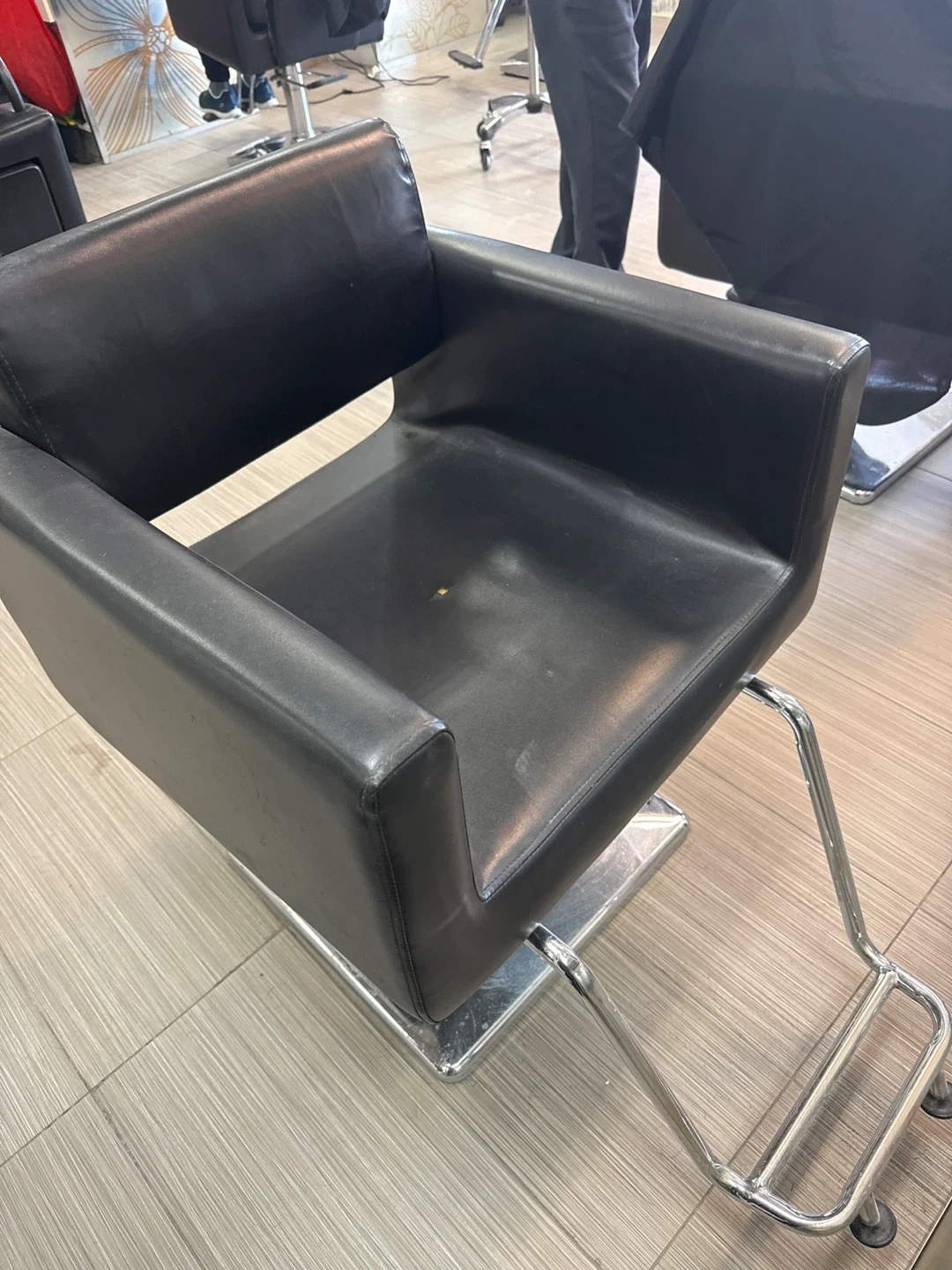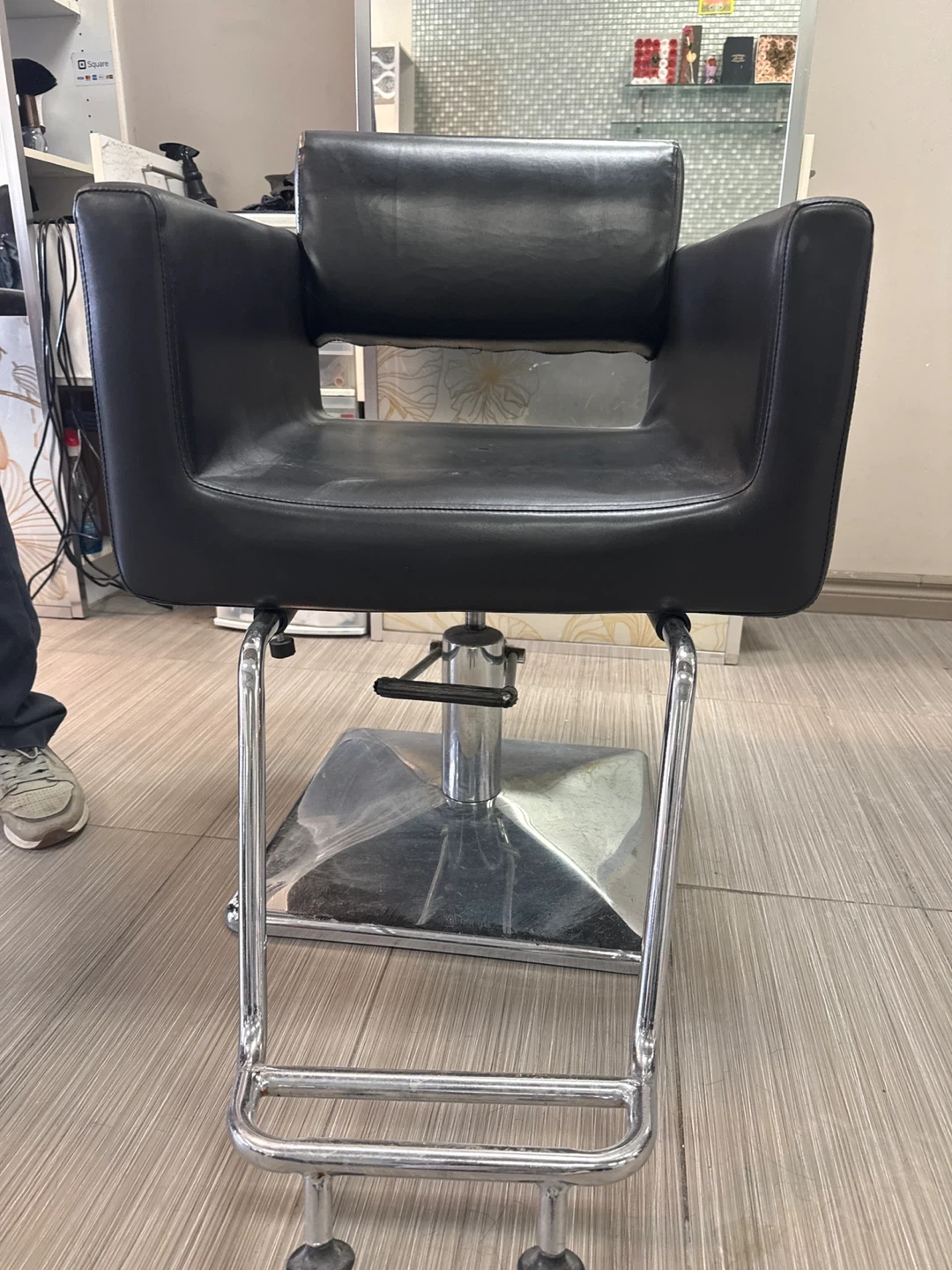 This is a black vinyl salon styling chair. It has a chrome hydraulic base and footrest. It's a sturdy chair suitable for any salon.