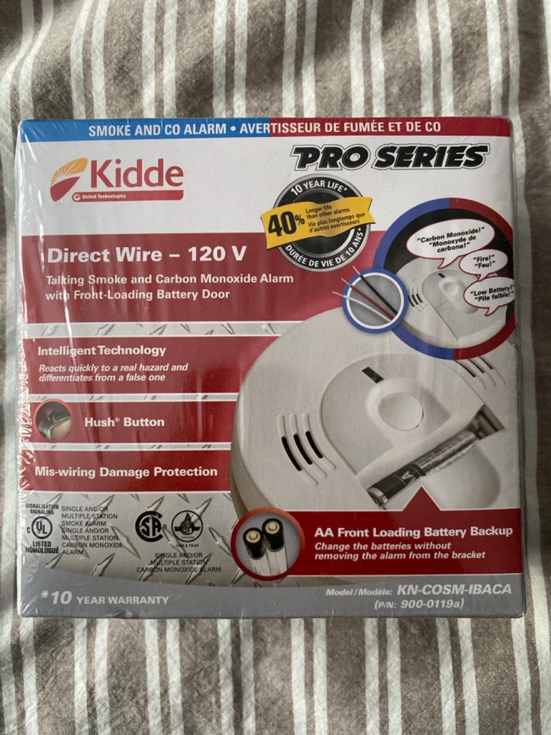 Selling a brand new Kidde Pro Series Smoke and Carbon Monoxide Alarm. It features a direct wire - 120V talking smoke and carbon monoxide alarm with a front-loading battery door. It also has intelligent technology that reacts quickly to a real hazard and differentiates from a false one. Comes with a hush button and mis-wiring damage protection. Model/Modele: KN-COSM-IBACA (P/N: 900-0119a)