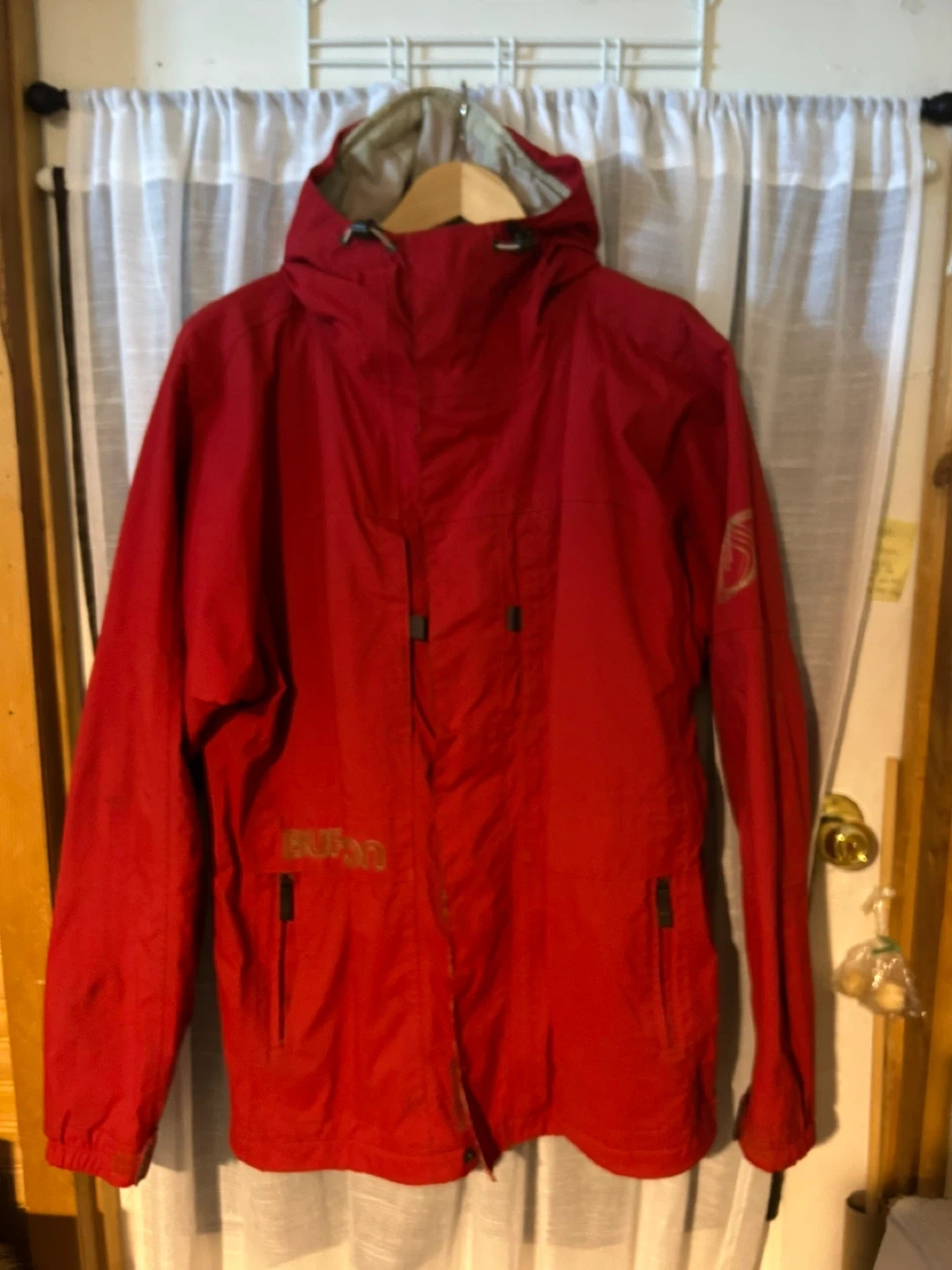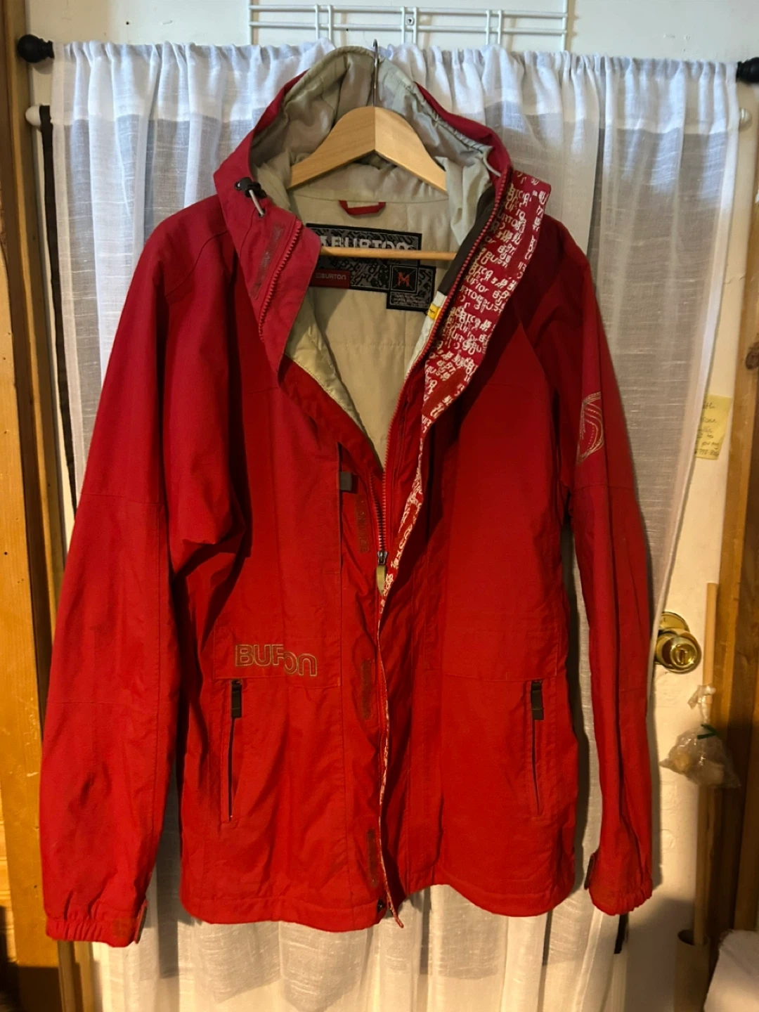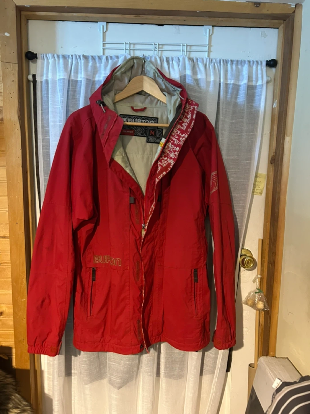 This is a red Burton snowboard jacket. It's a size medium and features a hood for extra warmth. It's great for hitting the slopes!