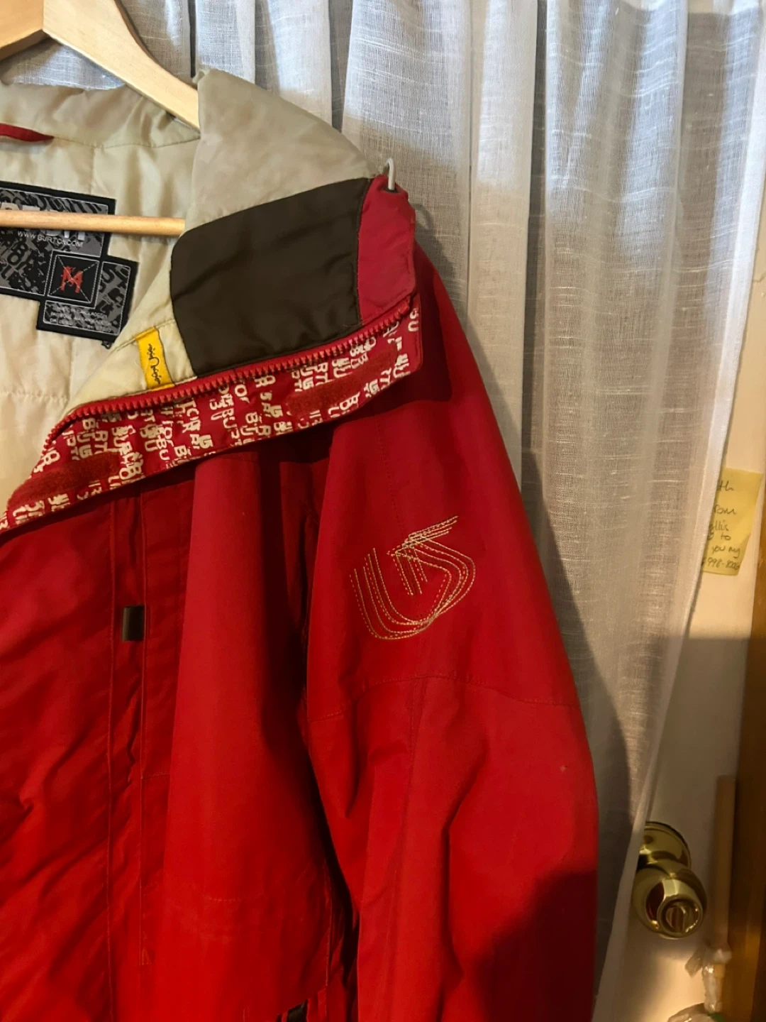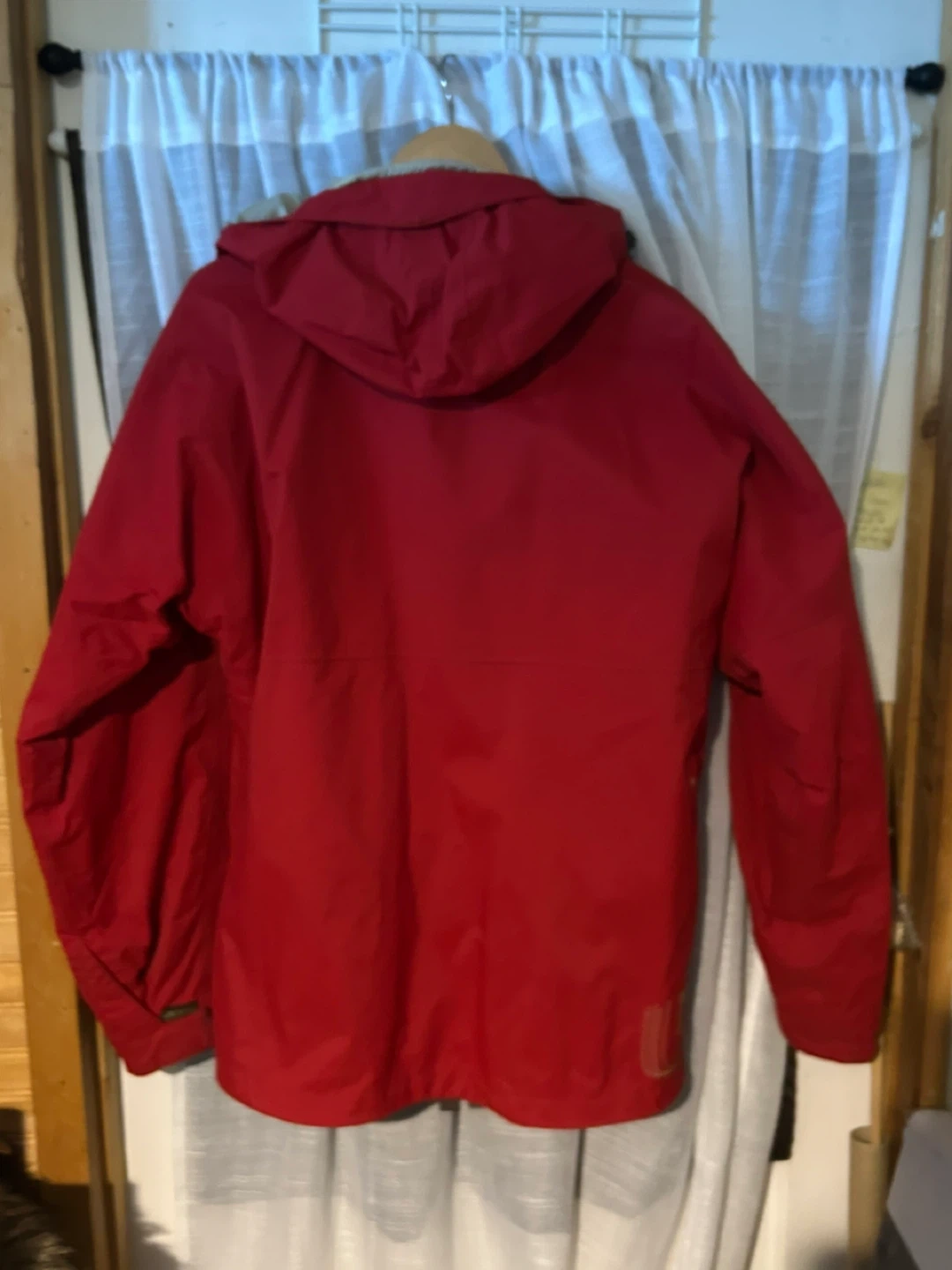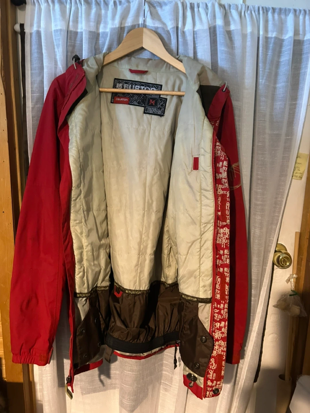 This is a red Burton snowboard jacket. It's a size medium and features a hood for extra warmth. It's great for hitting the slopes!