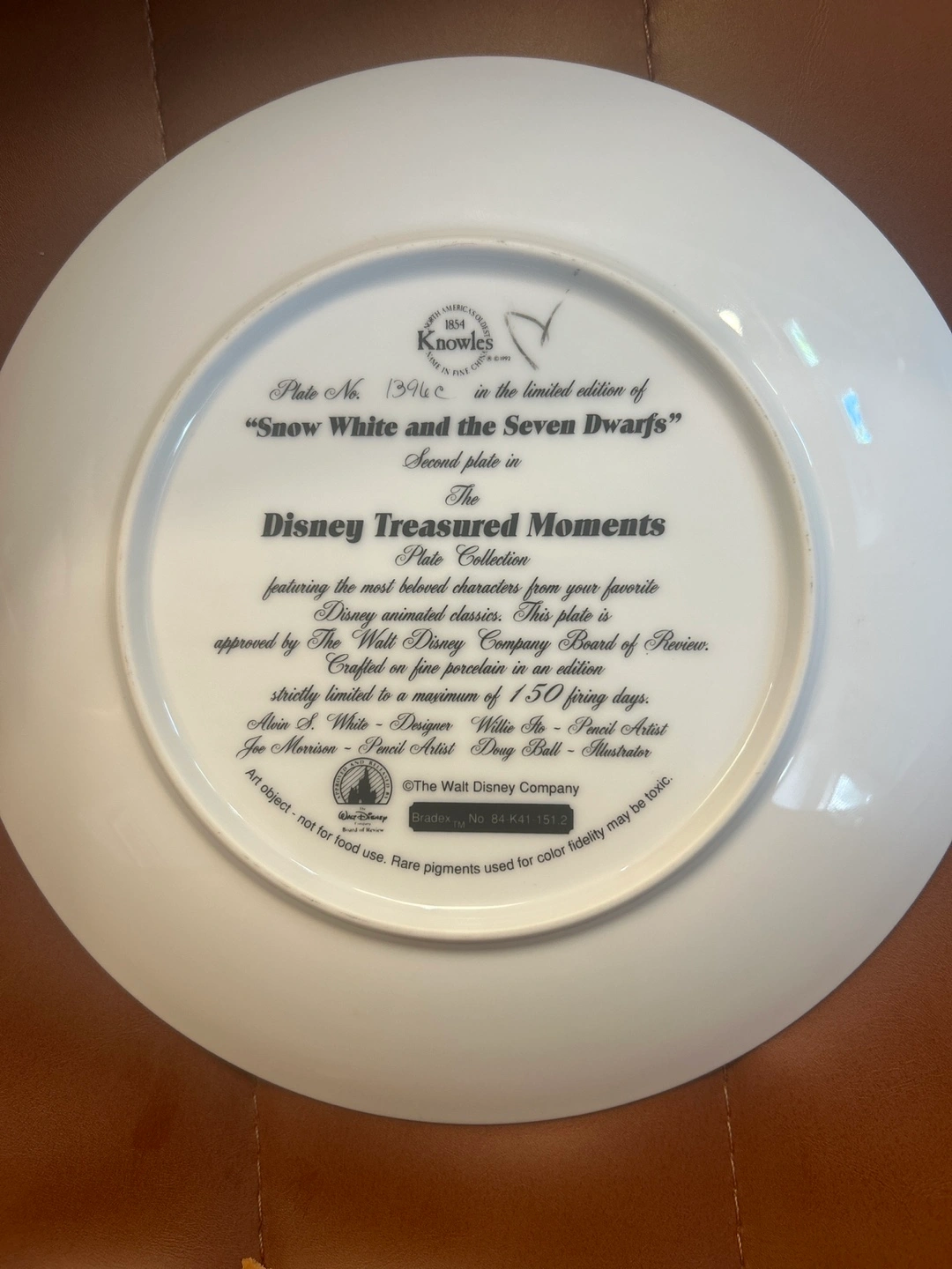 Selling a Knowles collector plate featuring Snow White and the Seven Dwarfs from the Disney Treasured Moments collection. It's the second plate in the series and crafted on fine porcelain. It's in great condition!