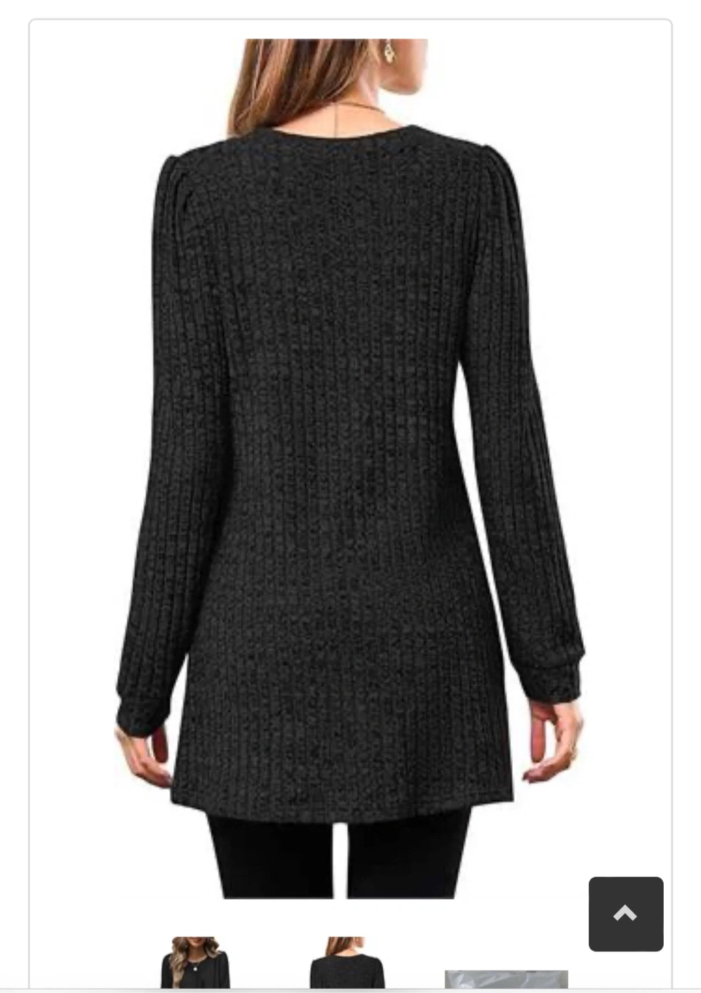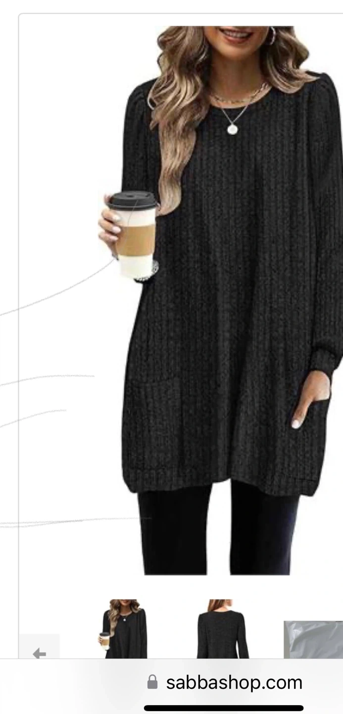 Comfy ribbed tunic sweater in black. It features long sleeves and handy front pockets. The material is soft and stretchy, perfect for casual wear.