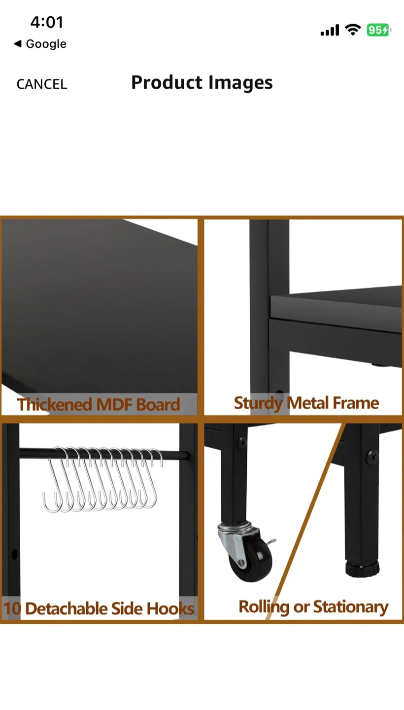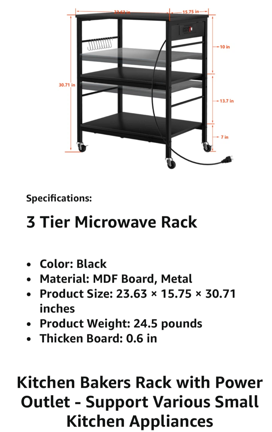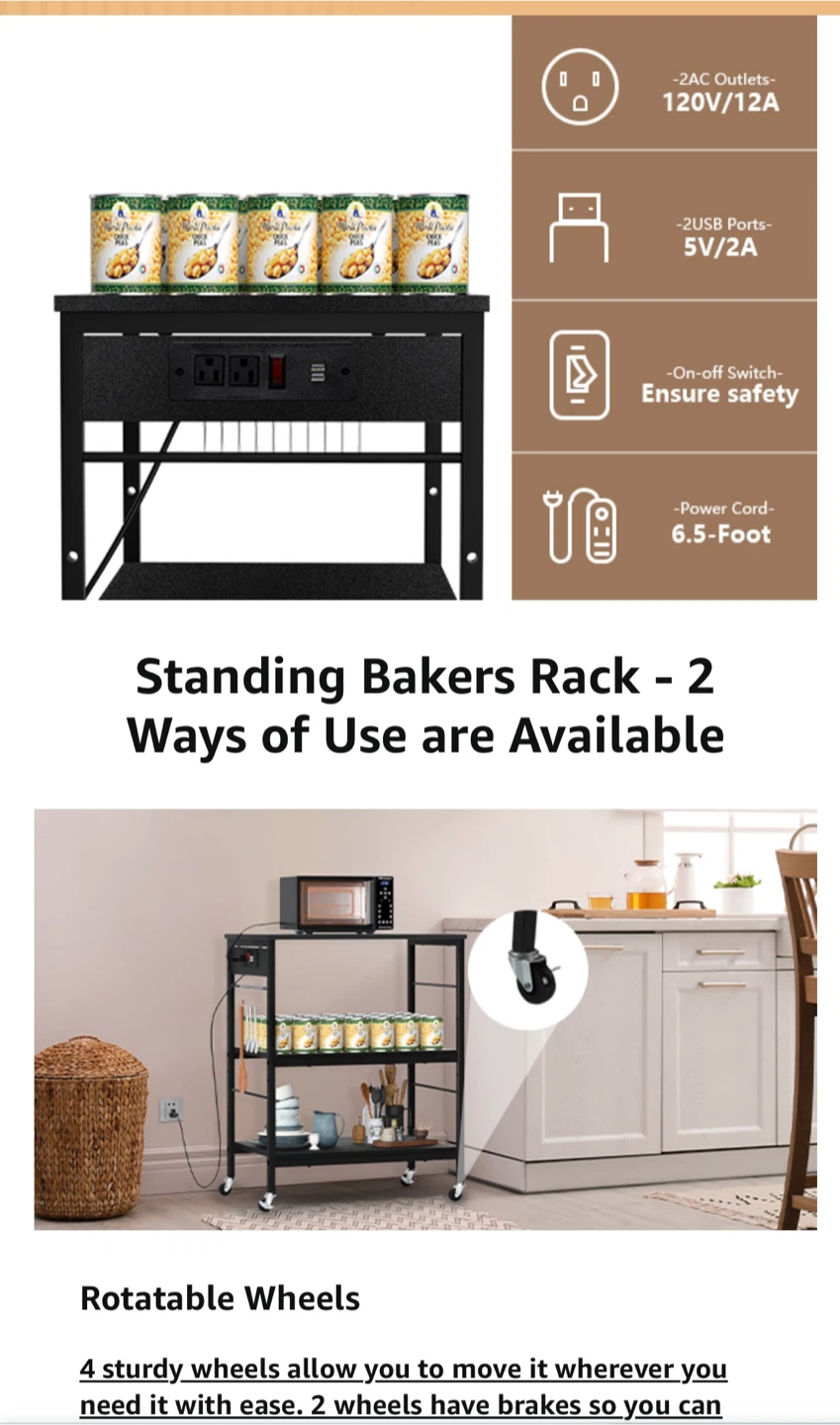 This kitchen cart features a sturdy metal frame and thickened MDF a built-in power strip with 2 AC outlets and 2 USB ports. The cart has rolling casters for mobility or can be used as a stationary unit. Its dimensions are 22.63" W x 15.75" D x 40.71" H, with shelf heights of 10", 13.7", and 7" from the bottom. This cart is handy for organizing kitchen appliances and supplies.
