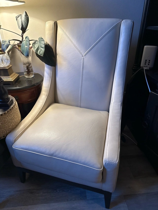 This is an Ethan Allen leather chair, perfect for adding a touch of elegance to any room. Like new. Original price $2800. Brand: Ethan Allen. Material: Leather. Colour: Cream. Style: Traditional. Condition: Used - Good. Cash accepted.
