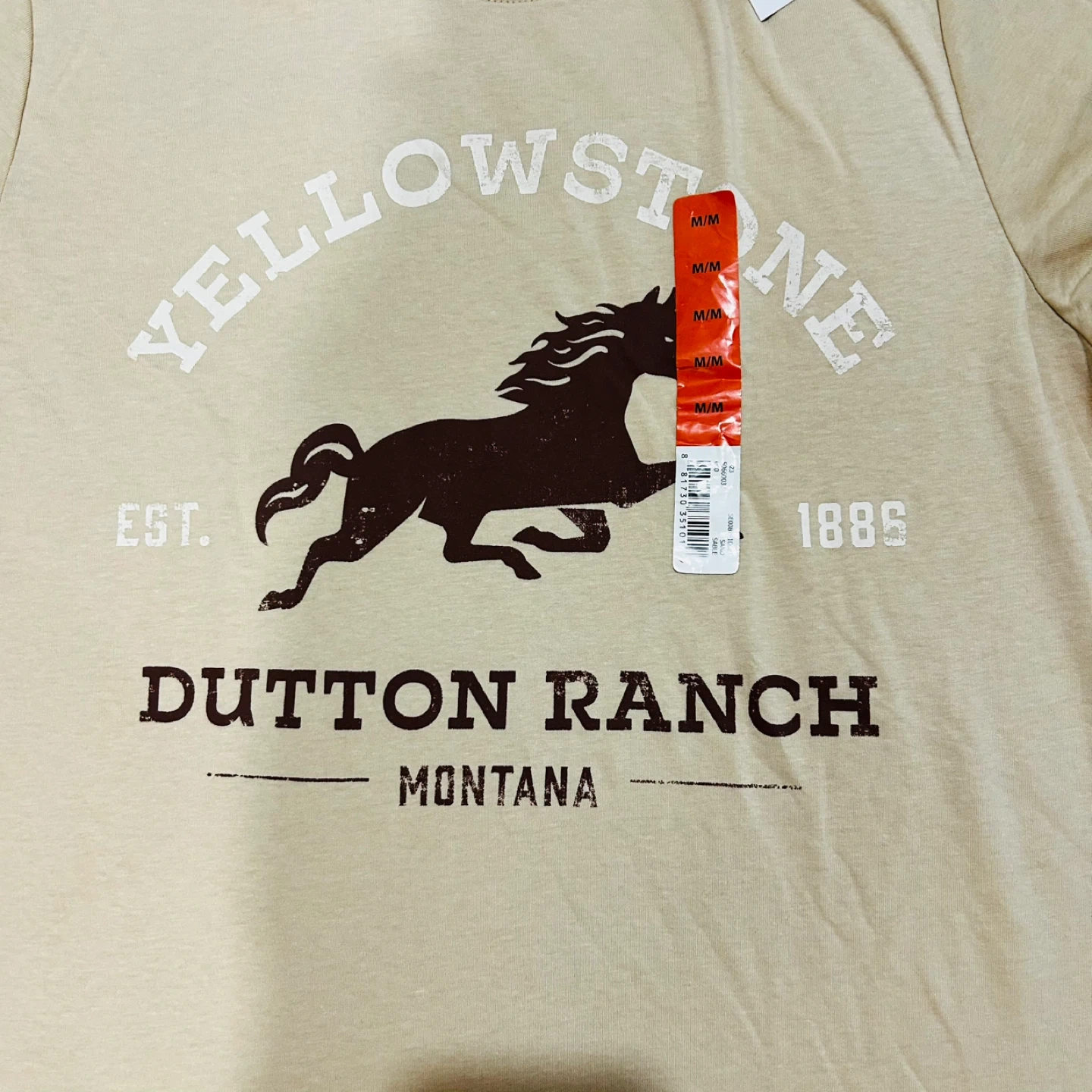 Selling a Yellowstone Dutton Ranch T-shirt in size medium. The shirt is a beige colour and made of 60% cotton and 40% polyester. Features a horse graphic and the text "Yellowstone EST. 1886 Dutton Ranch Montana".