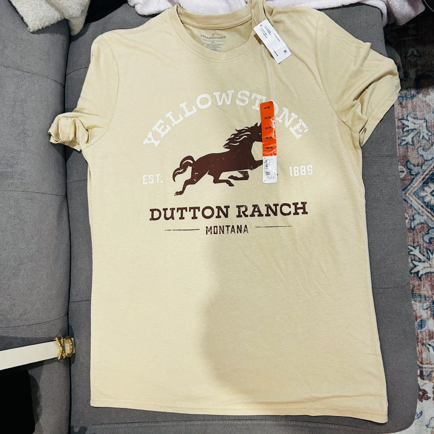 Selling a Yellowstone Dutton Ranch T-shirt in size medium. The shirt is a beige colour and made of 60% cotton and 40% polyester. Features a horse graphic and the text "Yellowstone EST. 1886 Dutton Ranch Montana".