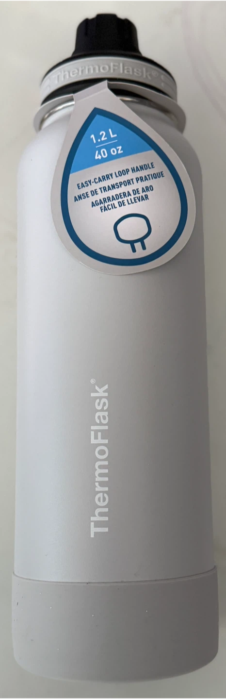 Selling a new ThermoFlask water bottle in grey! It holds 1.2L or 40oz. It also has an easy-carry loop handle, making it super convenient to take with you on the go
