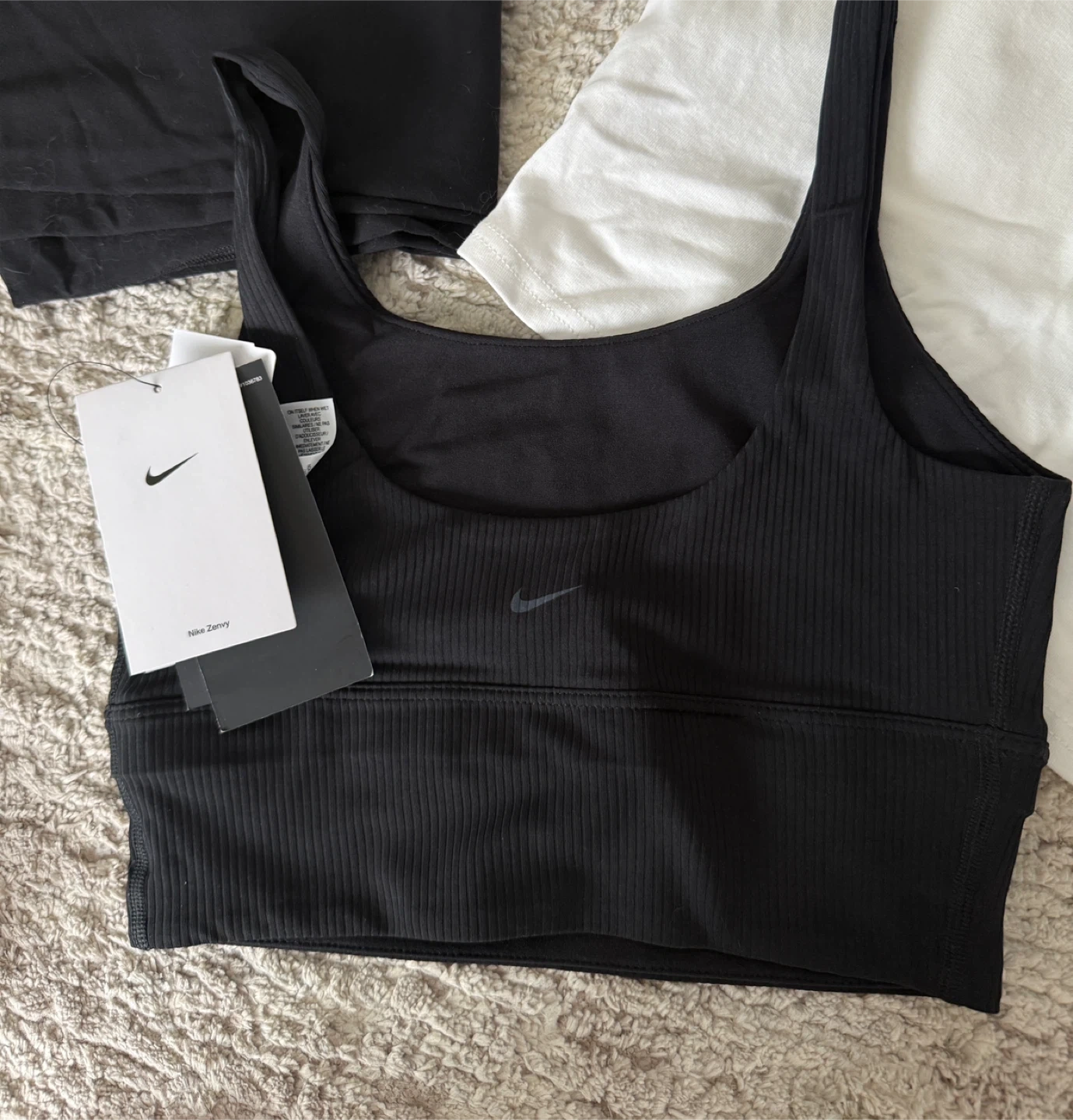 Selling a Nike Zenvy Ribbed Sports Tank in black, size xsmall. It's new with tags still attached! The leggings are size S, feel as same as Lululemon classic leggings. The top is white with a unique back design and padded!