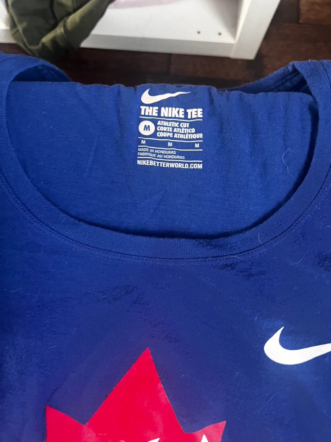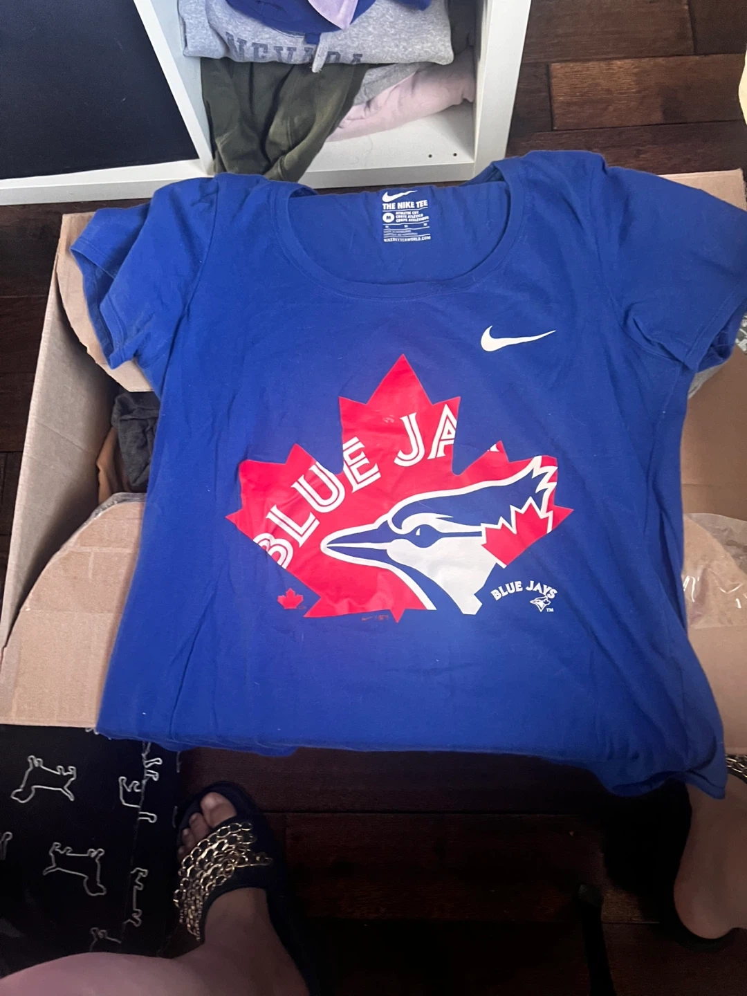 This is a royal blue Nike t-shirt featuring the Toronto Blue Jays logo. It's an athletic cut, size medium. Cotton blend fabric.