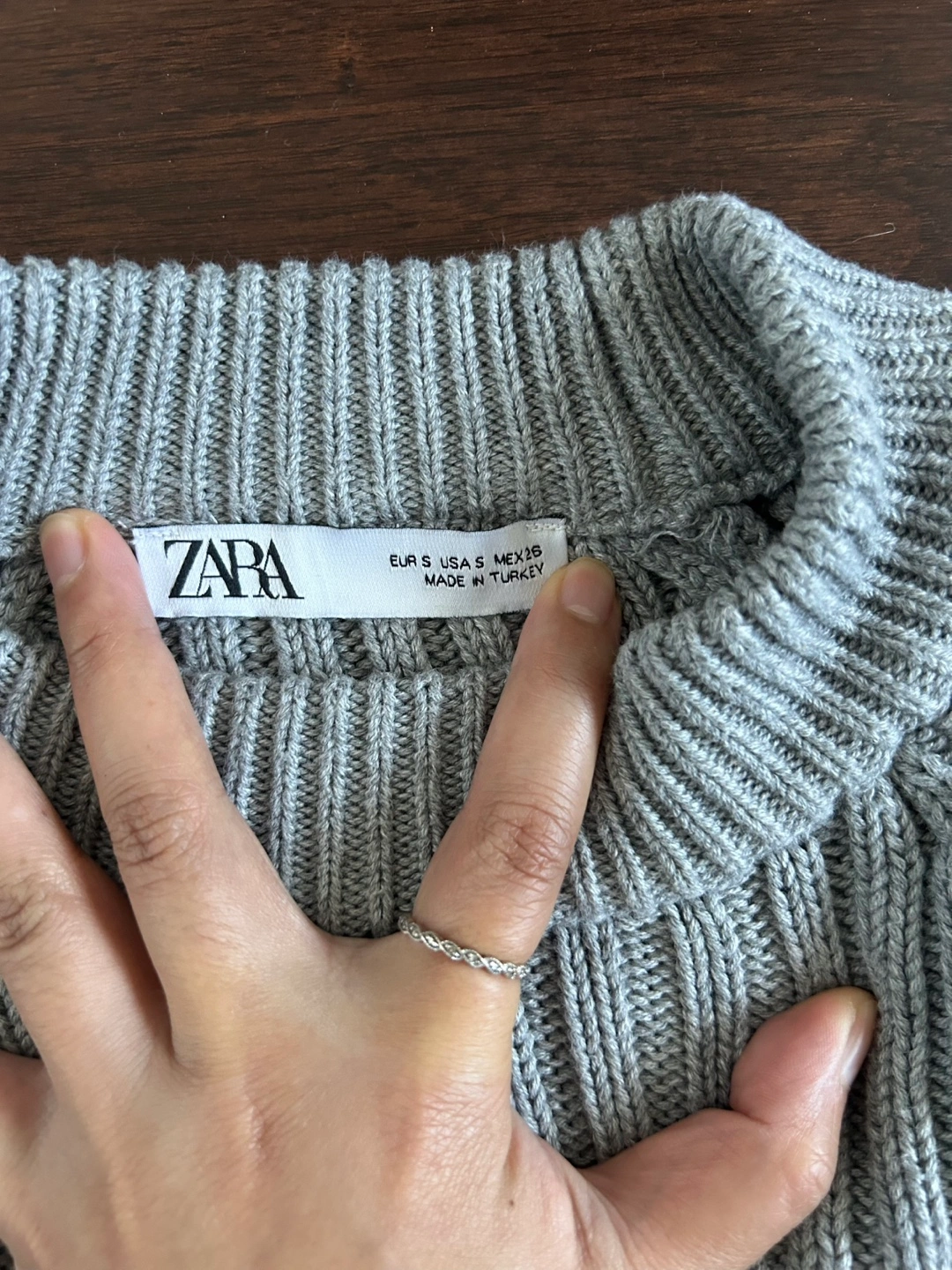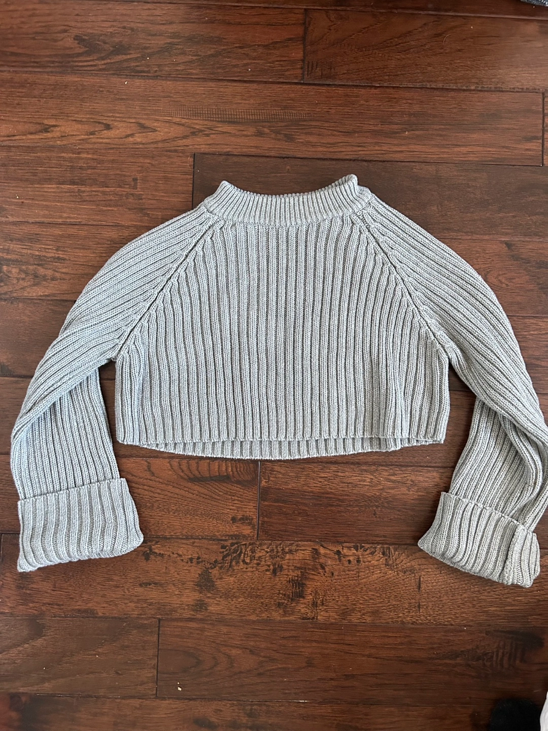 Grey cropped sweater with long sleeves and a mock neck. Fabric is thicker and has nice quality. Like new!