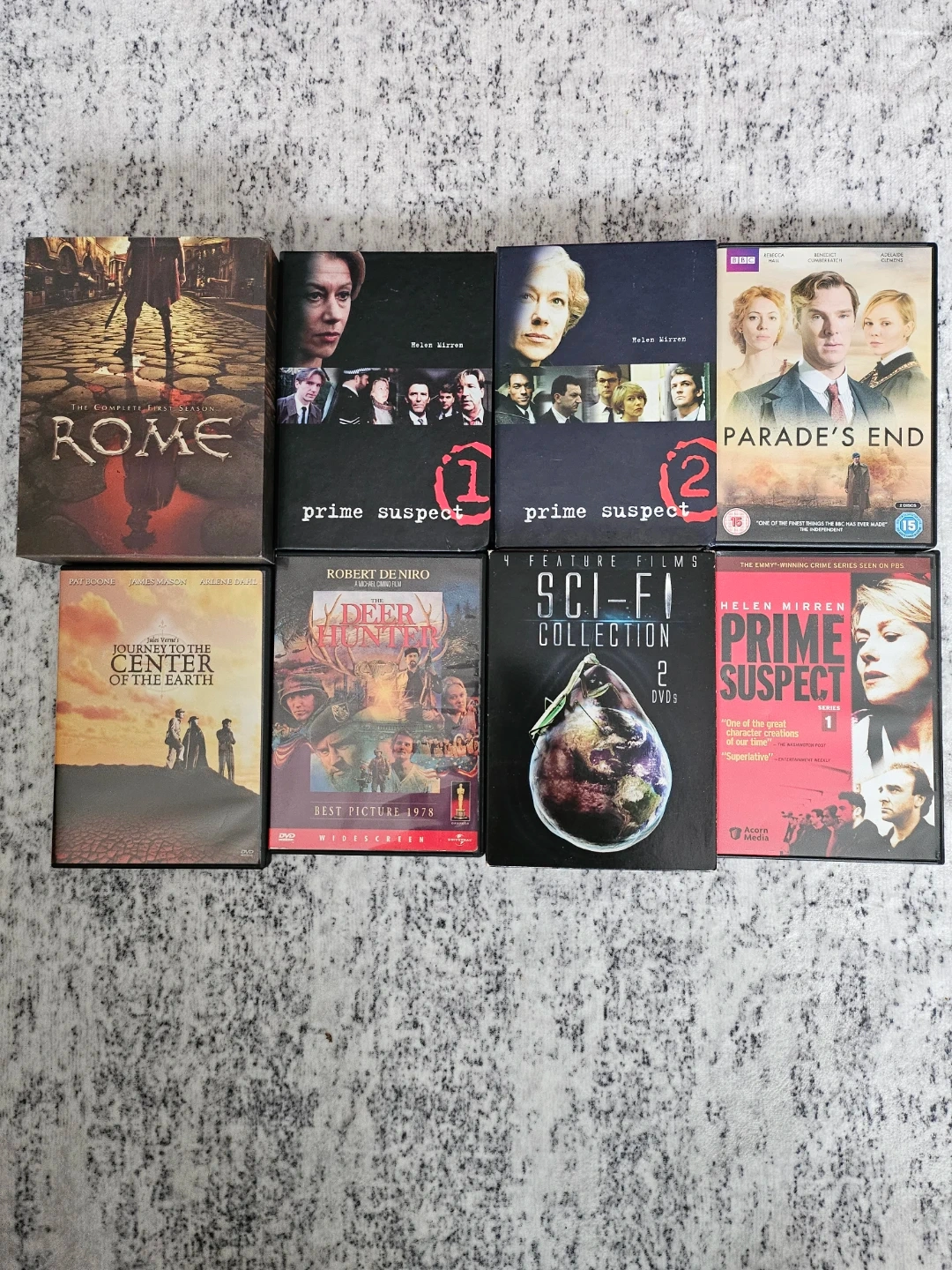 This lot includes the complete first season of Rome, multiple Prime Suspect DVDs featuring Helen Mirren, and Parade's End. It also contains Journey to the Center of the Earth and a Sci-Fi Collection with 2 DVDs. The Deer Hunter is also included.$1 each
