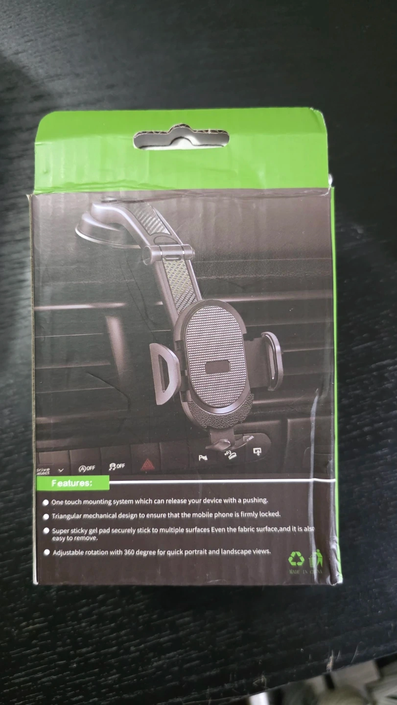 This mobile phone holder is designed for car use. It features a one-touch mounting system and a triangular mechanical design for secure phone placement. The sticky gel pad ensures it adheres to multiple surfaces, including fabric. It offers adjustable rotation for portrait and landscape views.