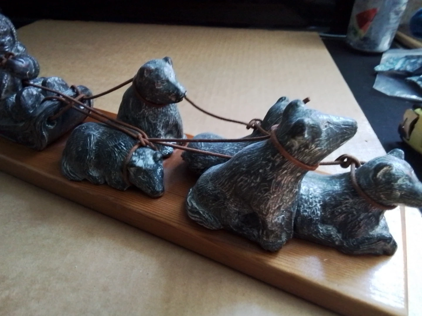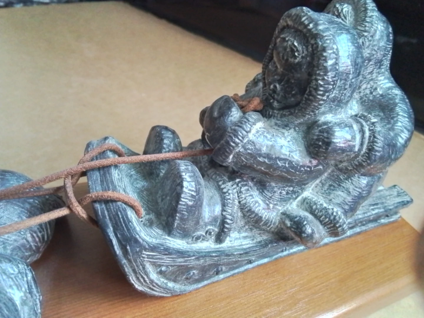 I am offering a Eskimo soapstone carving featuring a dog sled team, with dimensions of 14x4 inches. This unique piece showcases detailed craftsmanship and artistry, depicting a traditional scene. The carving is in excellent condition, making it a perfect addition to any collection or as a distinctive decorative item.