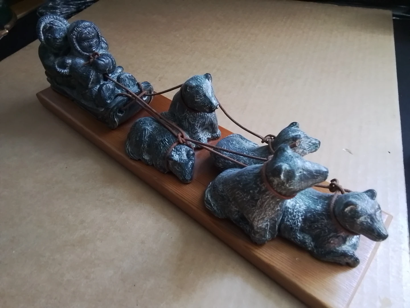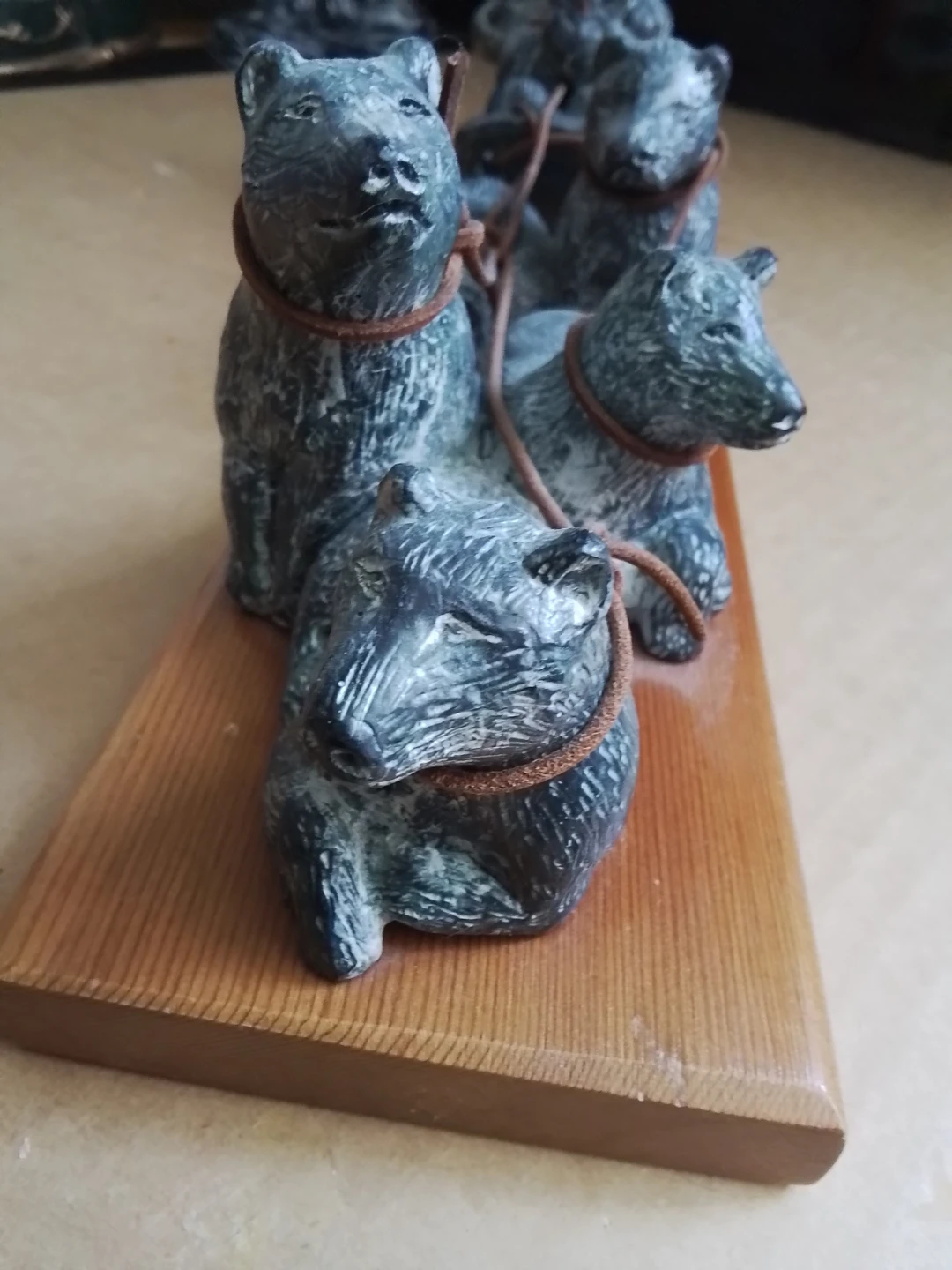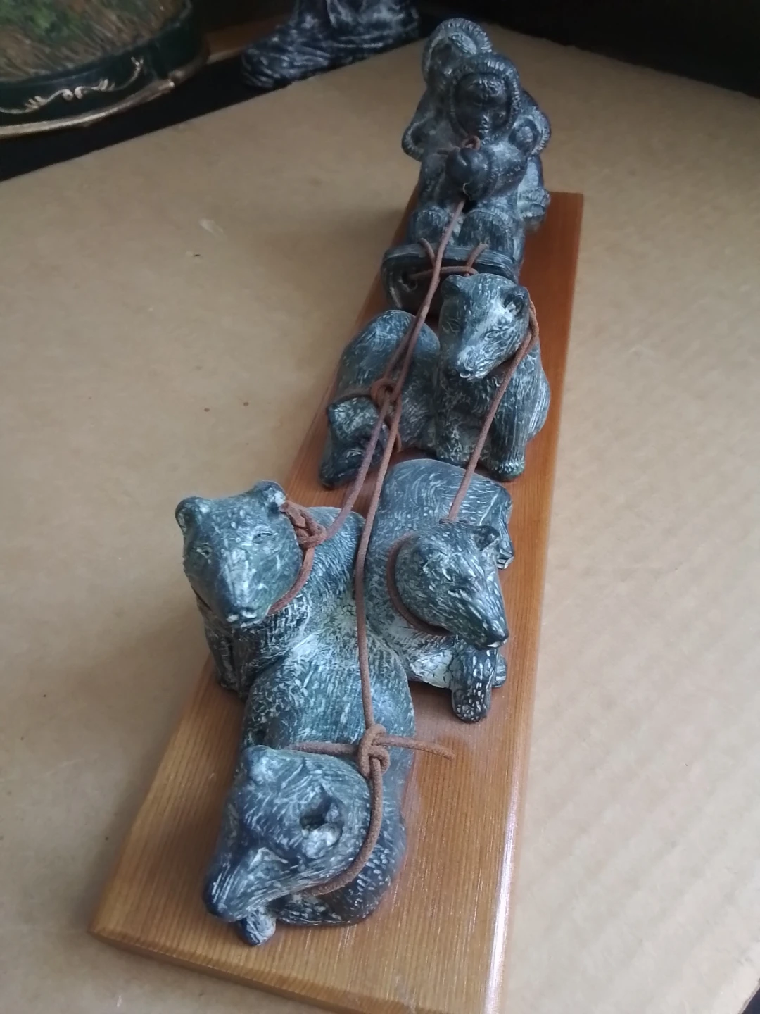 I am offering a Eskimo soapstone carving featuring a dog sled team, with dimensions of 14x4 inches. This unique piece showcases detailed craftsmanship and artistry, depicting a traditional scene. The carving is in excellent condition, making it a perfect addition to any collection or as a distinctive decorative item.
