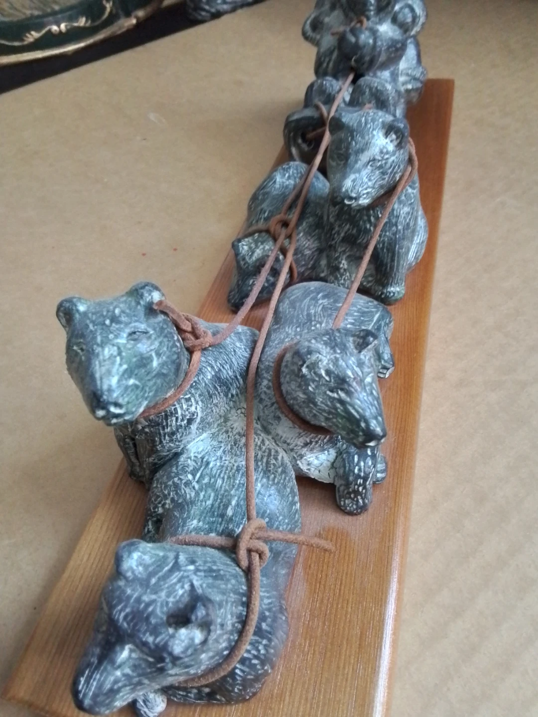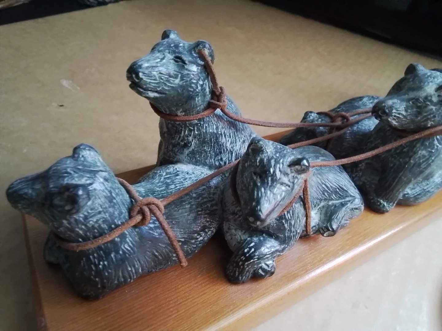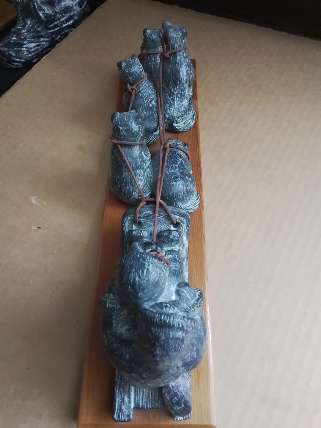 I am offering a Eskimo soapstone carving featuring a dog sled team, with dimensions of 14x4 inches. This unique piece showcases detailed craftsmanship and artistry, depicting a traditional scene. The carving is in excellent condition, making it a perfect addition to any collection or as a distinctive decorative item.