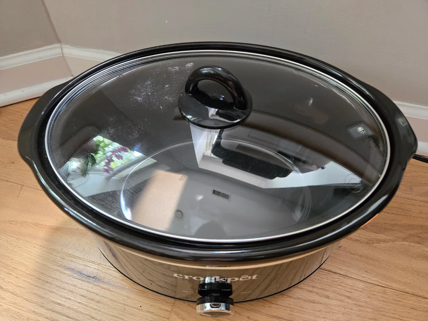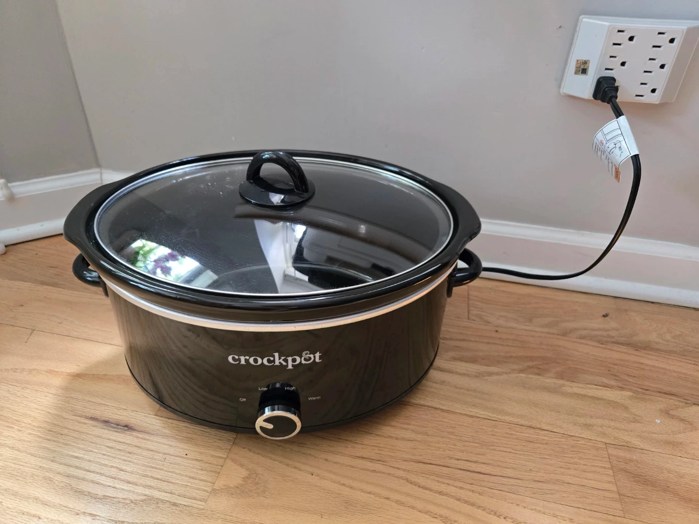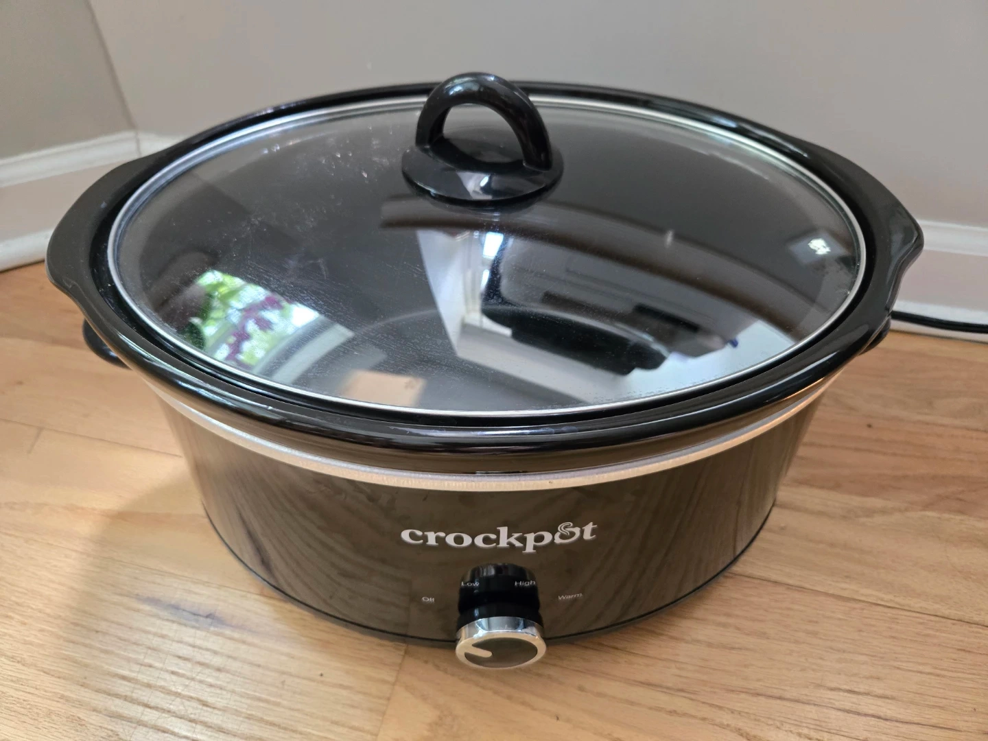 This is a black Crock-Pot slow cooker with a glass lid. It has three heat settings: low, high, and warm. The stoneware insert is removable for easy cleaning.
