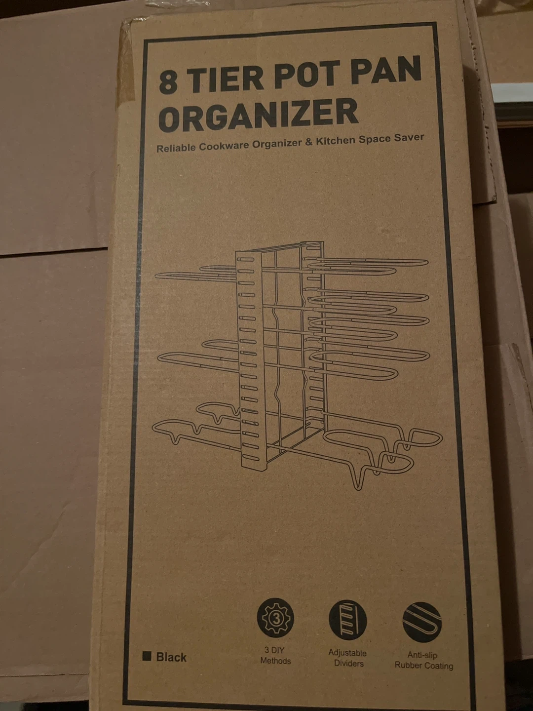 Selling a brand new 8 Tier Pot Pan Organizer! It's a reliable cookware organizer and kitchen space saver. It features adjustable dividers, anti-slip rubber coating, and can be assembled in 3 DIY methods. It's black and comes in its original box 📦 NEW