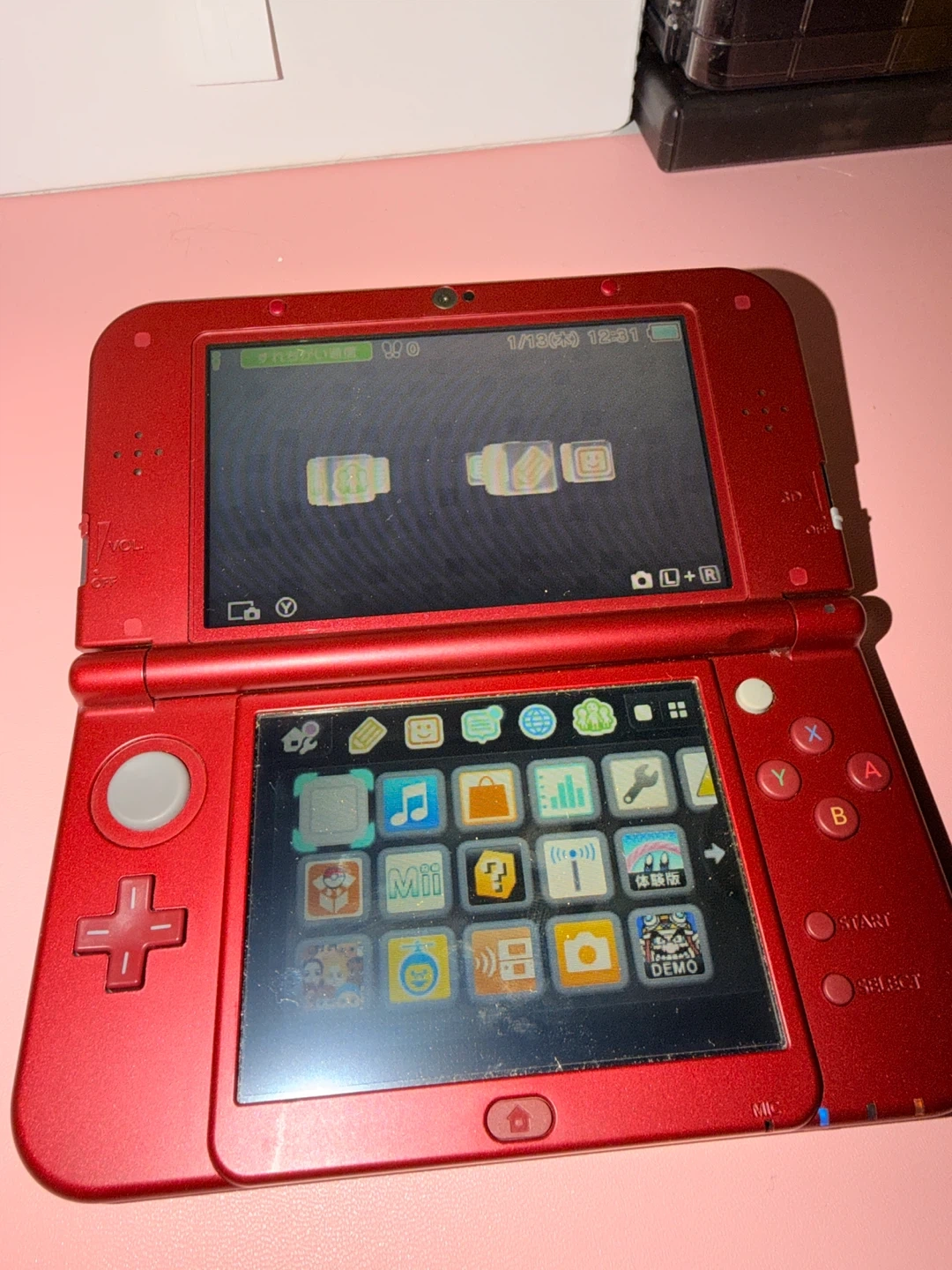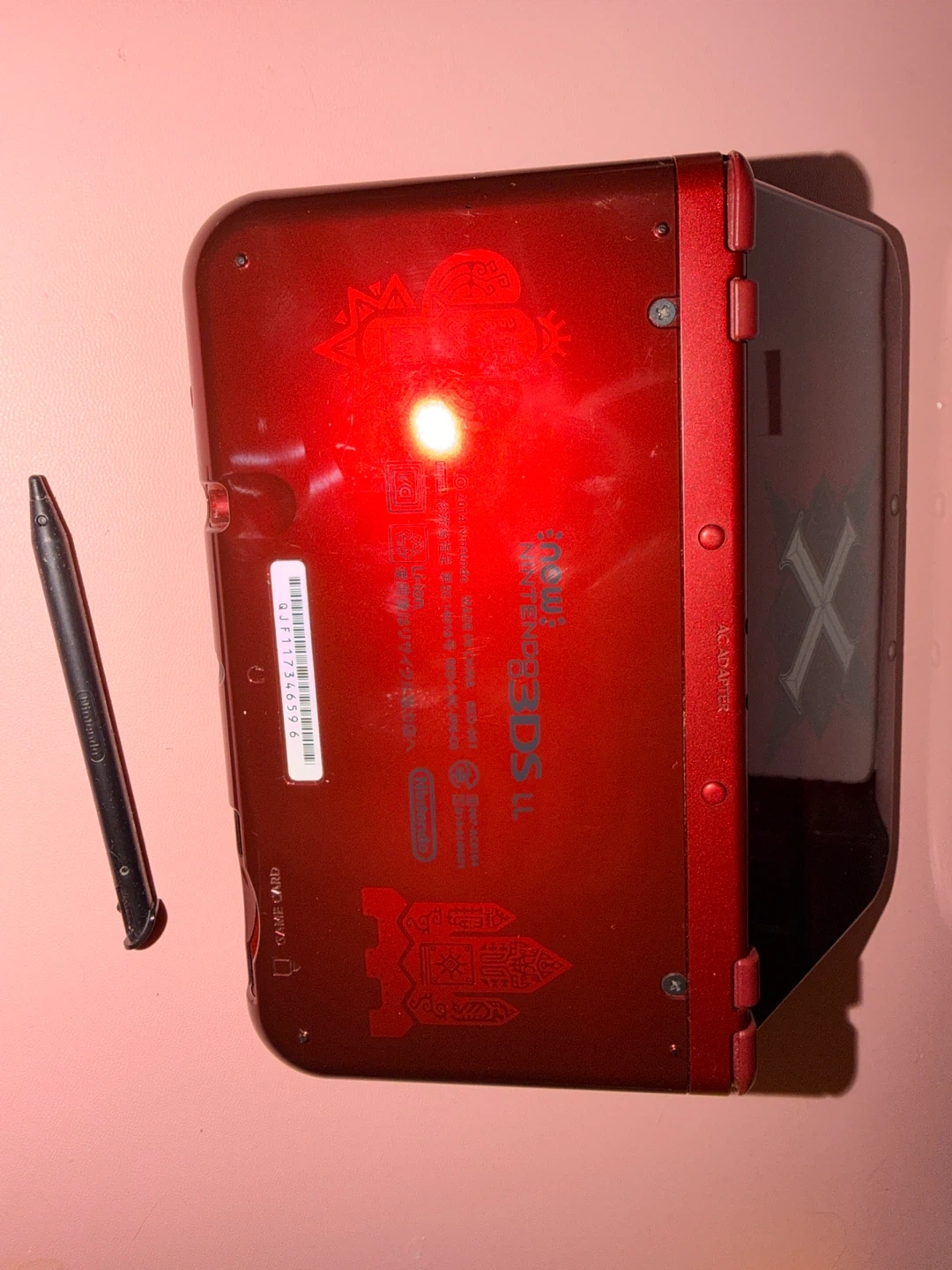 This is a red Nintendo New 3DS LL console with a Monster Hunter X design. It comes with a stylus and original box. The LL model offers a larger screen size.