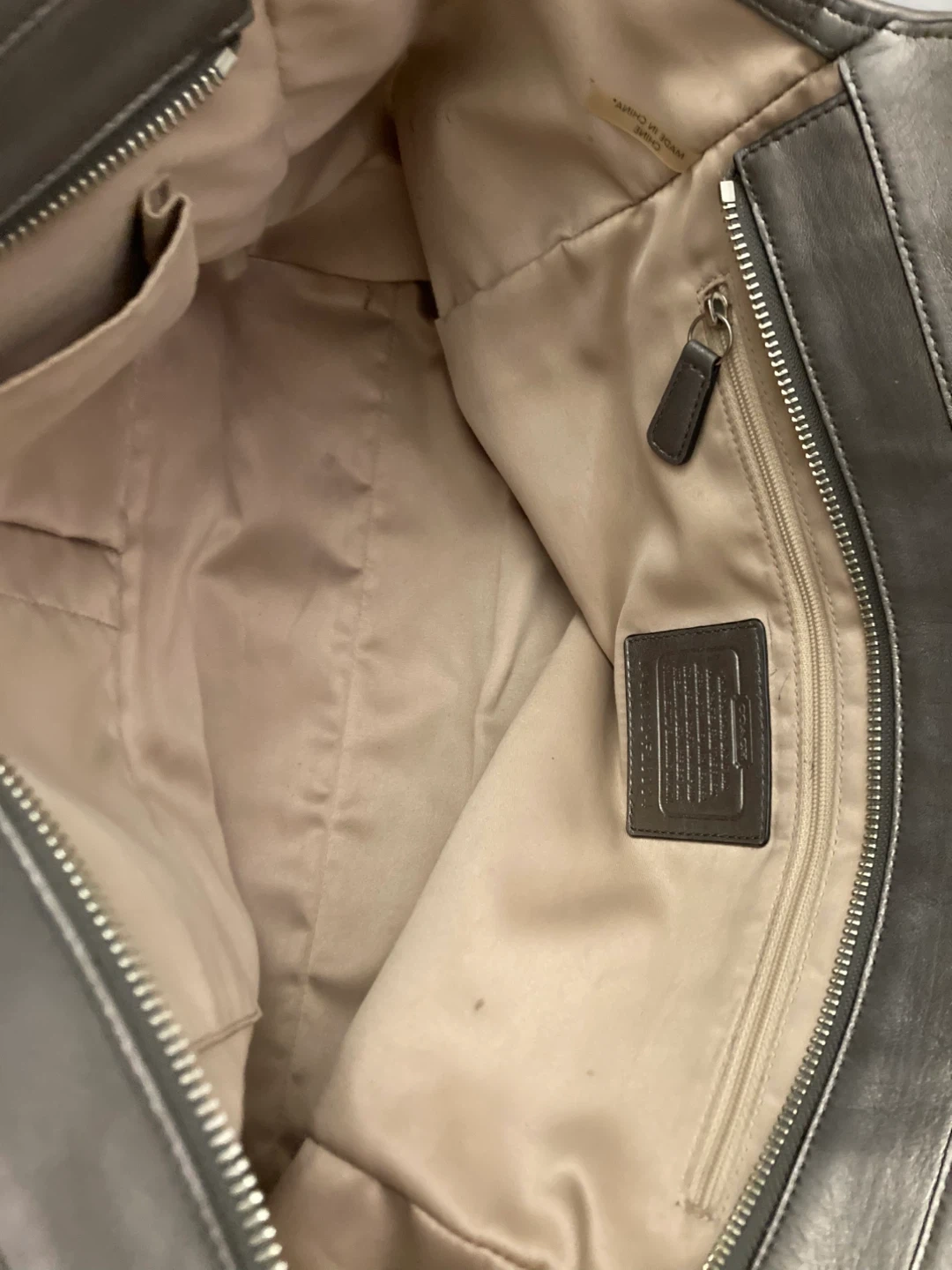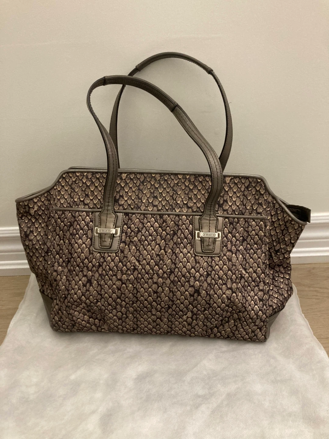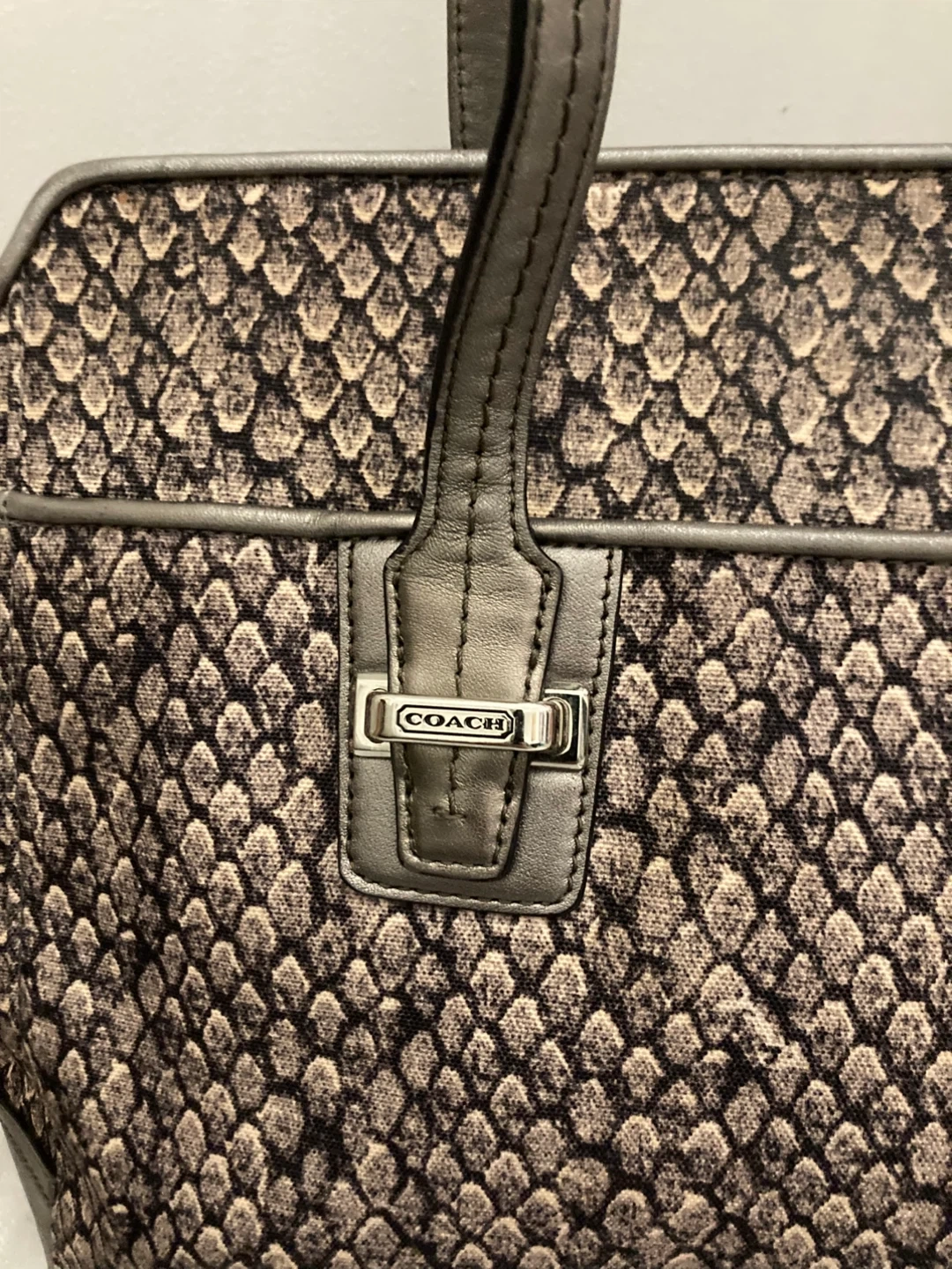 This is a COACH tote bag with a snakeskin pattern. It features a spacious interior with pockets. Bag is made of fabric with leather trim.
