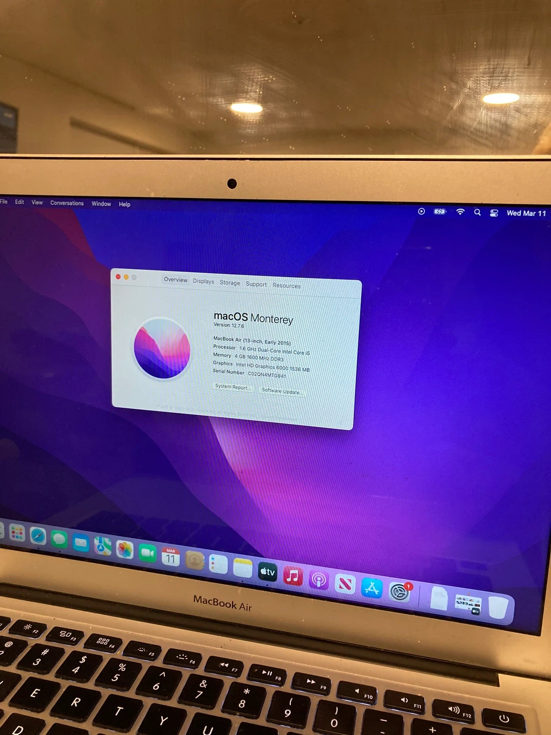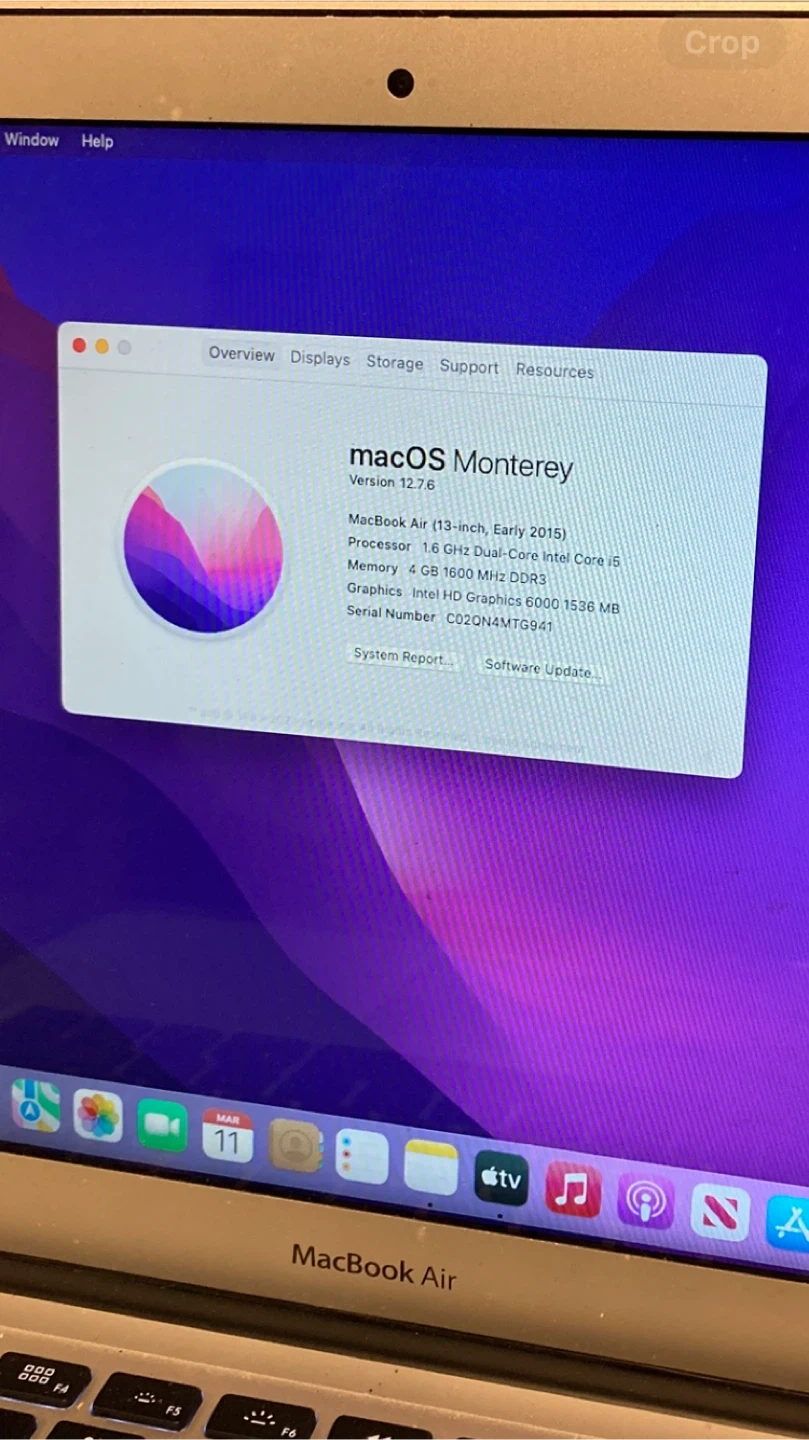 Apple MacBook Air (13-inch, Early 2015) laptop. It's powered by a 1.6 GHz Dual-Core Intel Core i5 processor and has 4 GB 1600 MHz DDR3 memory. Graphics are handled by Intel HD Graphics 6000. This model runs macOS Monterey version 12.7.6.