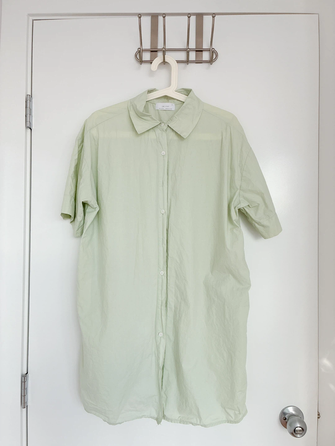 This is an Oak + Fort short sleeve shirt dress in a light green colour. It's a size S/P and made in Korea. It's a simple button-up style.